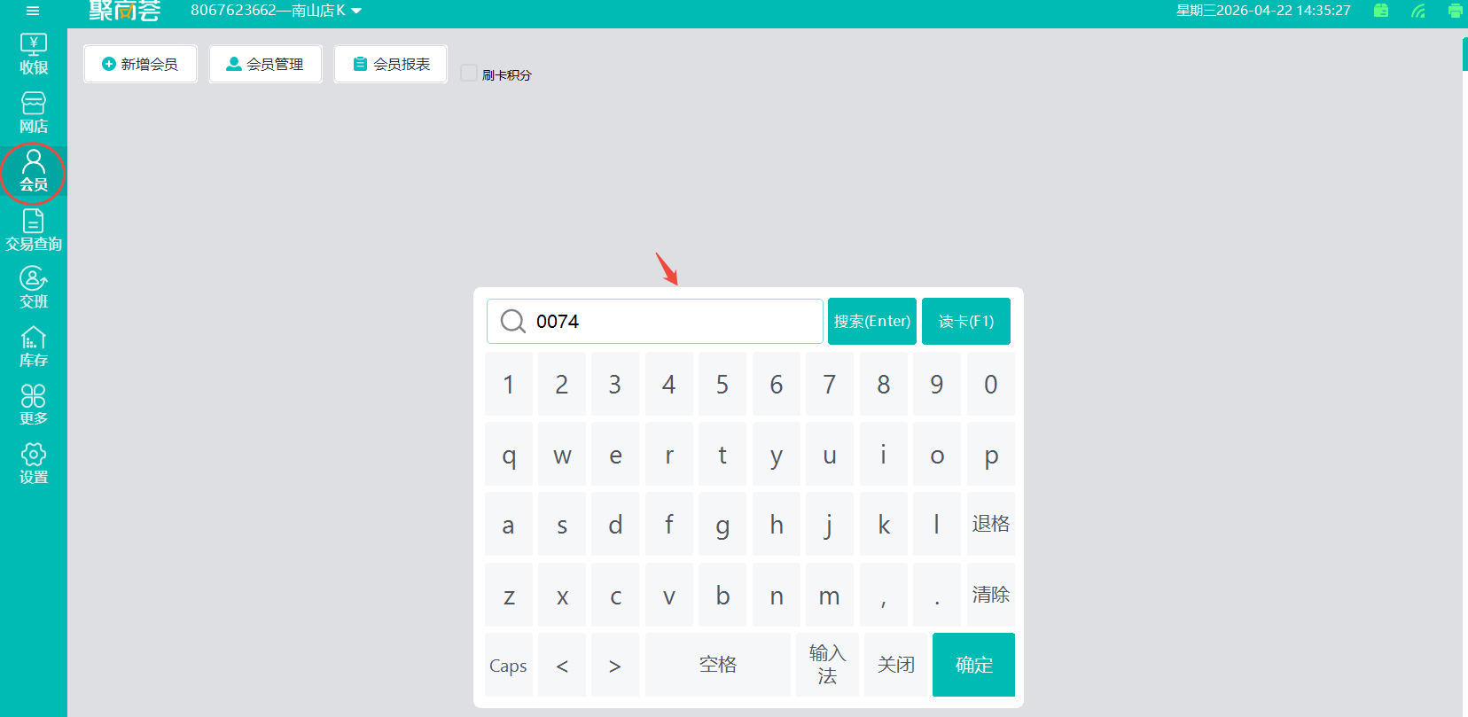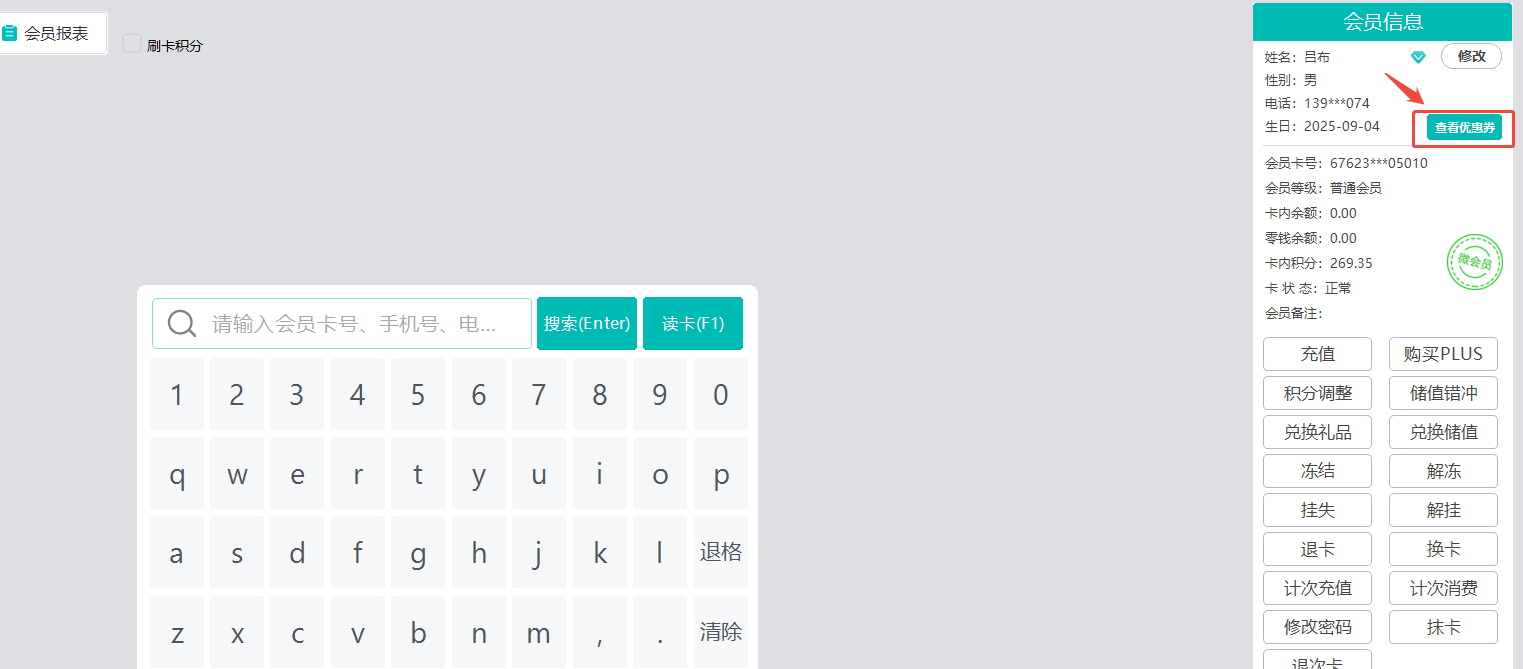 登录POS前台,在会员菜单查询会员信息(会员卡号/会员编号/手机号/手机号后四位/会员姓名/会员二维码扫码)