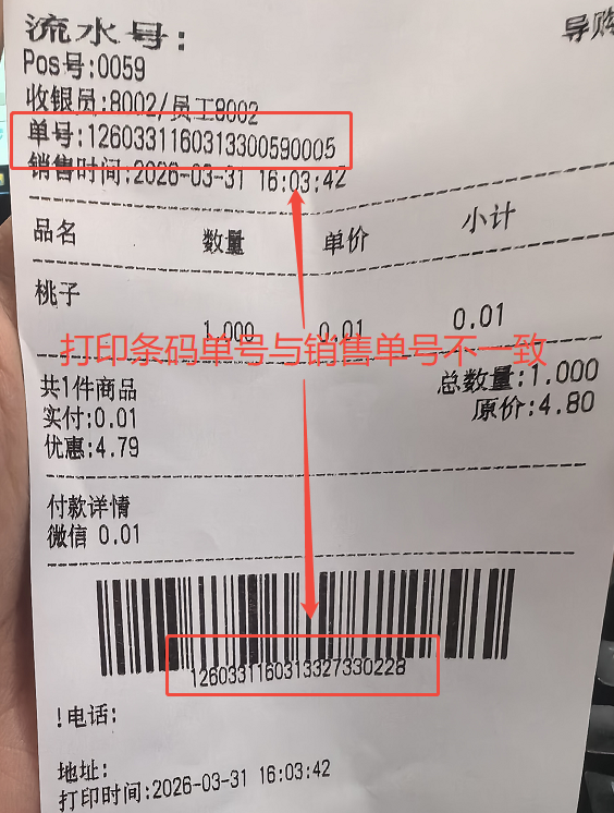 如图下图所示:打印结账小票显示非销售单号的异常单号