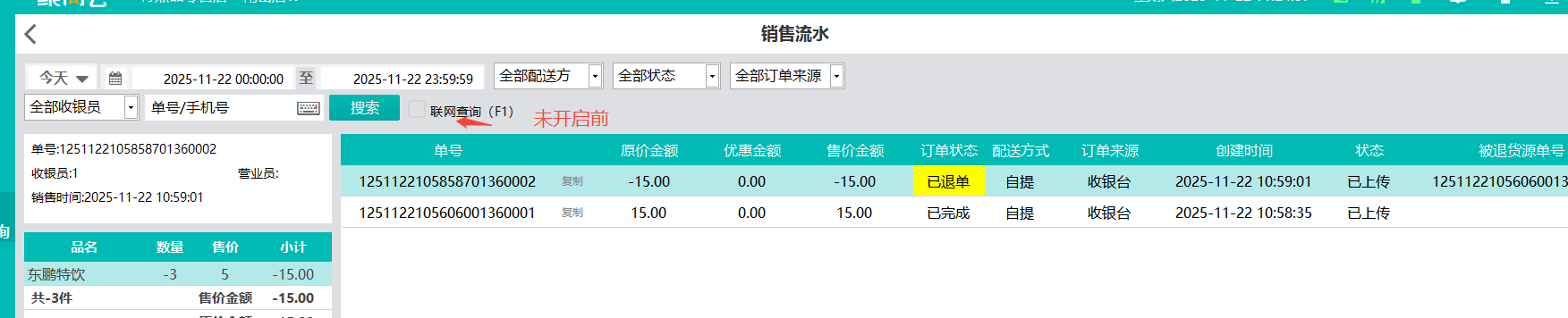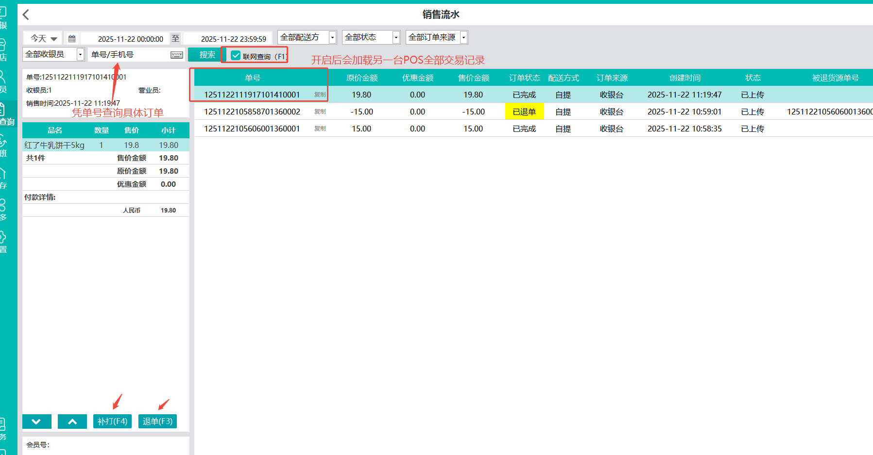 操作流程:使用有联网销售单权限员工账号登录02编号POS机,在交易查询-勾选联网查询(F1快捷键勾选/取消),会加载其他pos及交易记录,输入会员手机号或销售单号查询具体订单信息,可在查询后进行退单/补打操作,支持整单及部分退货。