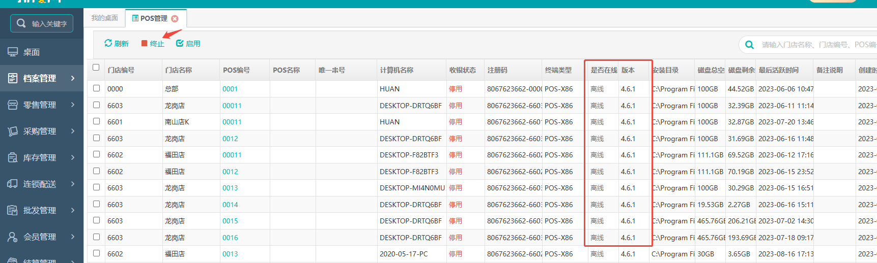 2、检查商户所有门店已经不使用POS,全部收银状态要停用掉,不然会检测到版本未升级