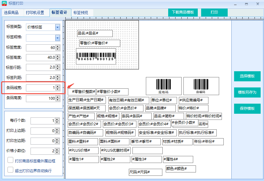 登录前台->设置->条码价签->添加条形码->条码线宽设置最小为1