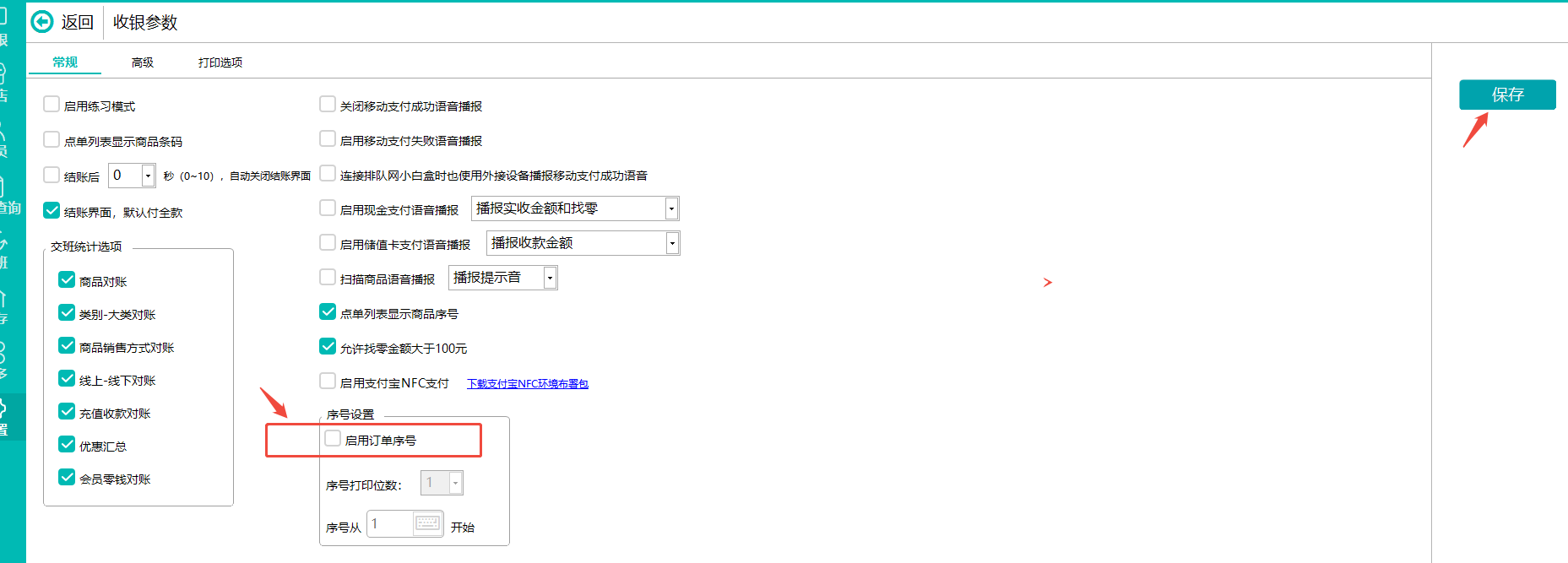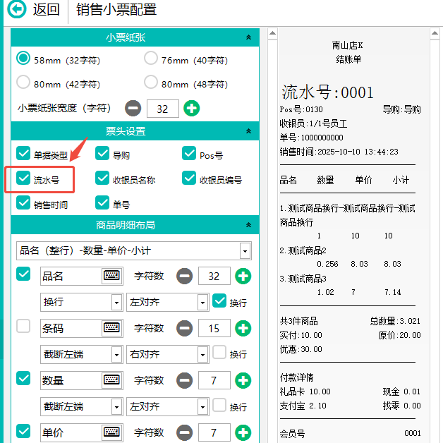 未打印流水号需检查收银模板-顶部-流水号的参数项是否勾选