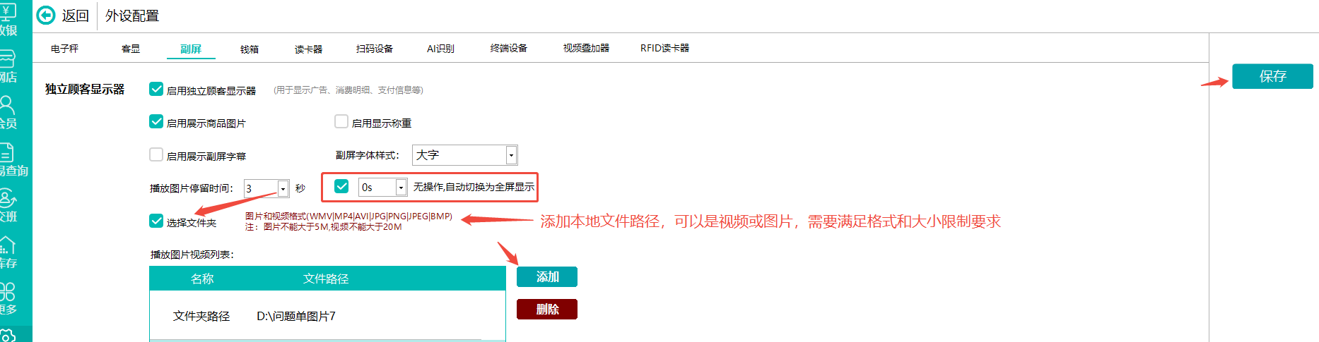 参数设置:登录聚商荟POS前台->设置->外设->副屏->启用独立顾客显示器->设置0s无操作,自动切换为全屏显示->勾选选择文件夹->添加(本地图片或者视频)->保存->重启POS生效。