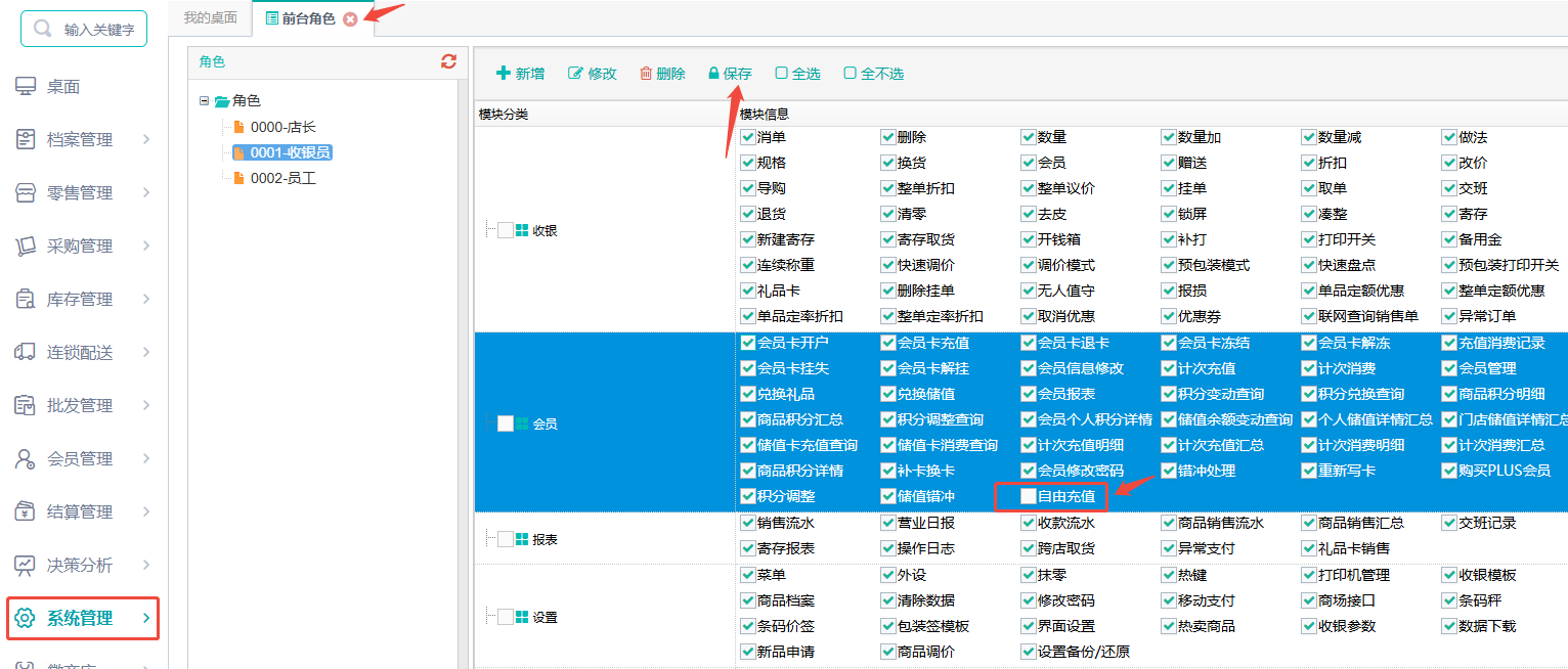 登录聚商荟后台->系统管理->前台角色->选择需要授权前台角色->会员模块,勾选【自由充值】->保存即可。