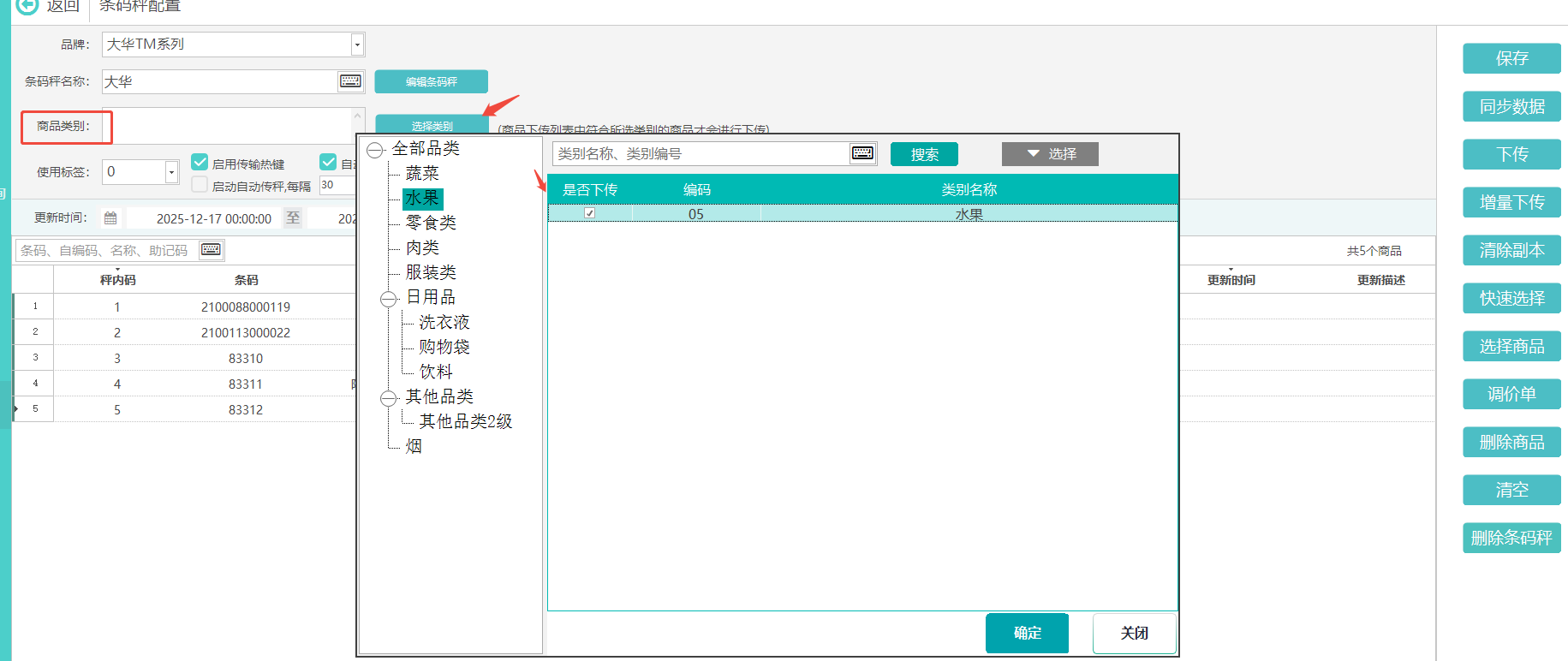 条码秤配置支持按类别下传指定商品到对应条码秤,在商品类别里选择当前秤需要下传那个类别里的商品