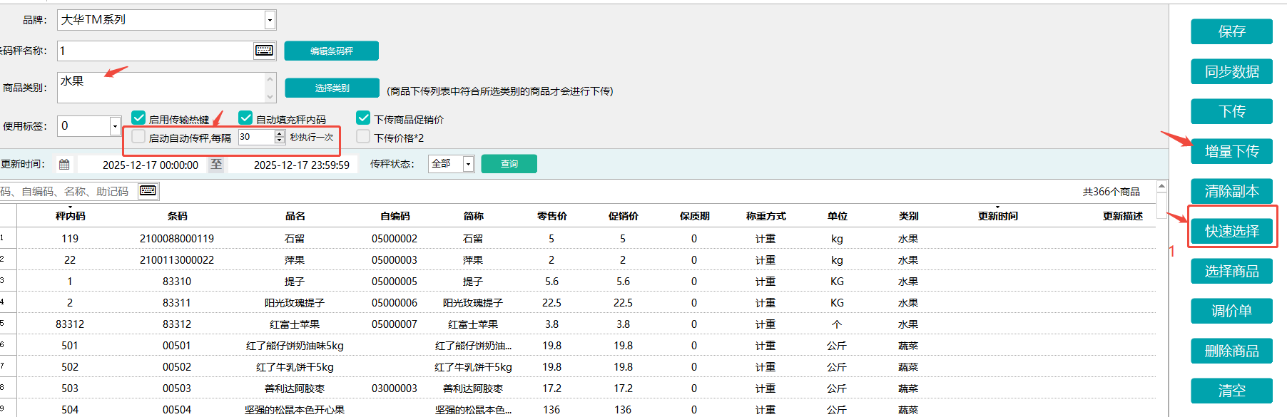 PS: 点快速选择后传秤商品列表会显示所有称重商品,但不会全部商品都下传到这台条码秤,会自动过滤掉,实际只有选择了下传商品类别里的商品才会下传成功。
