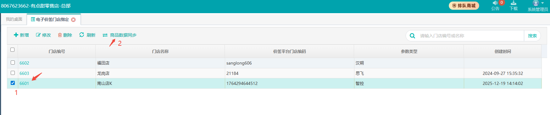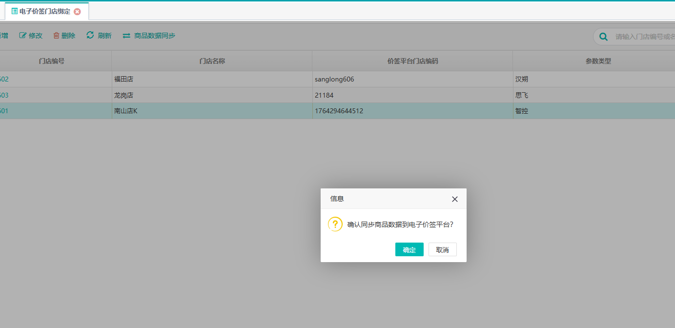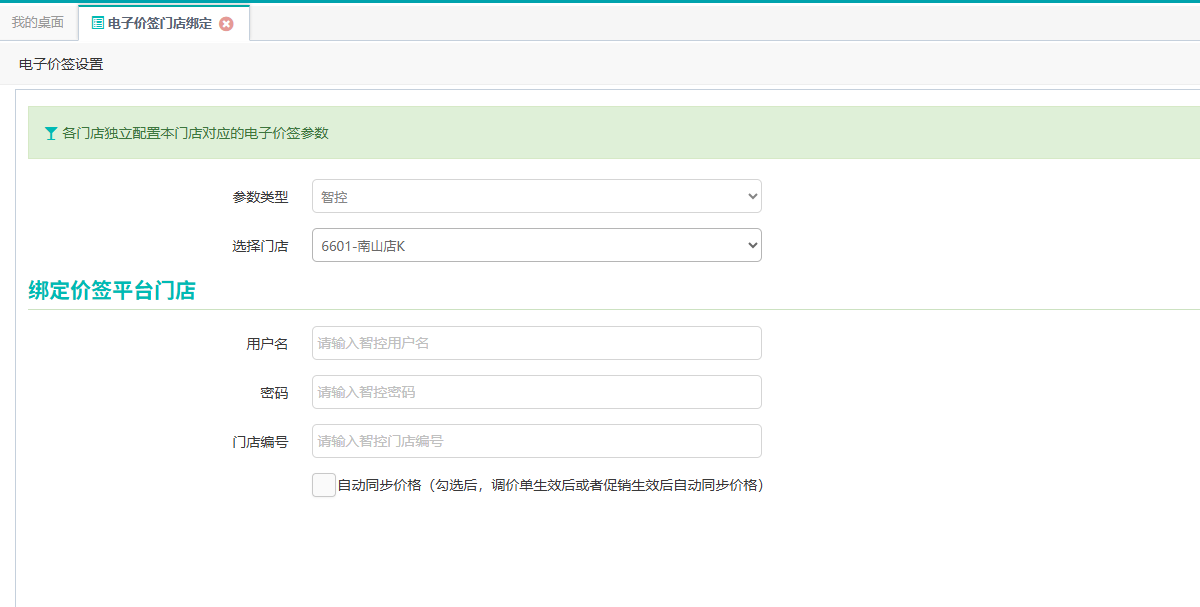 登录聚商荟后台 sso.paidui.com ->系统管理->电子价签门店绑定->新增->填写智控价签对接参数>勾选自动同步价格(勾选后,调价单生效后或者促销生效后自动同步价格)->保存。