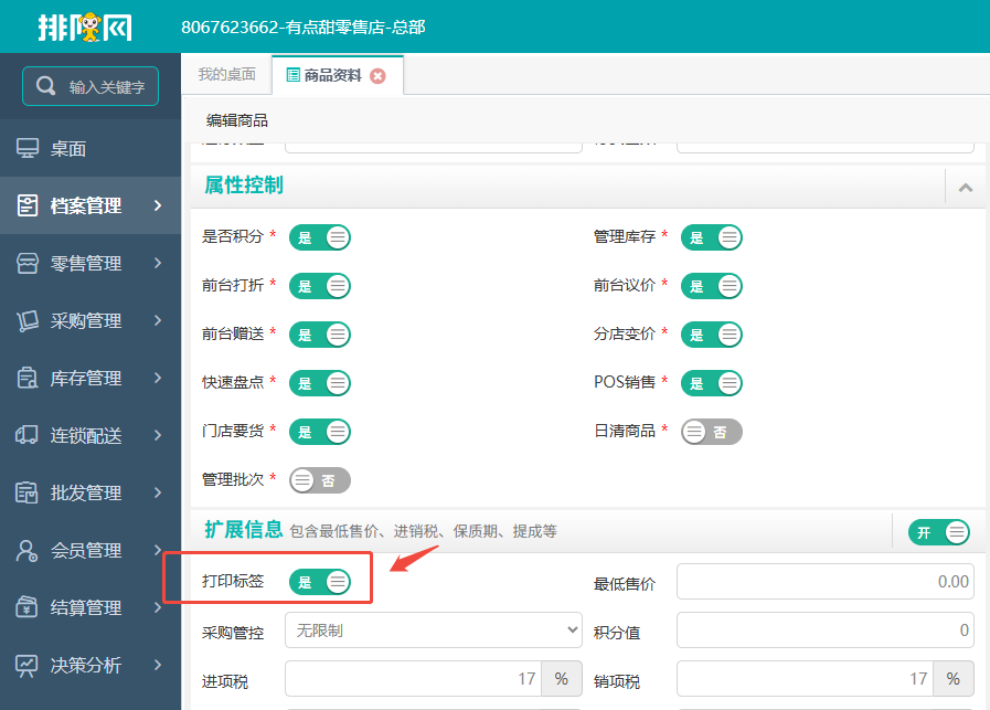 1、聚商荟后台->档案管理->商品资料->扩展信息->开启打印标签的属性