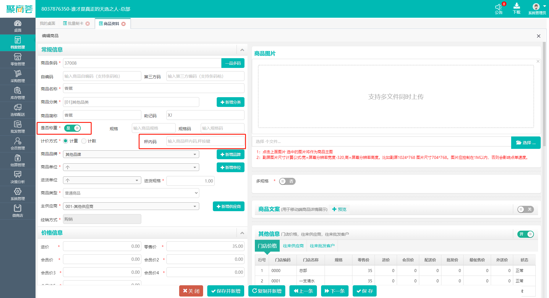 1.在商品资料-常规信息-开启是否称重,会显示出秤内码的输入项目,根据秤上的热键进行设置即可