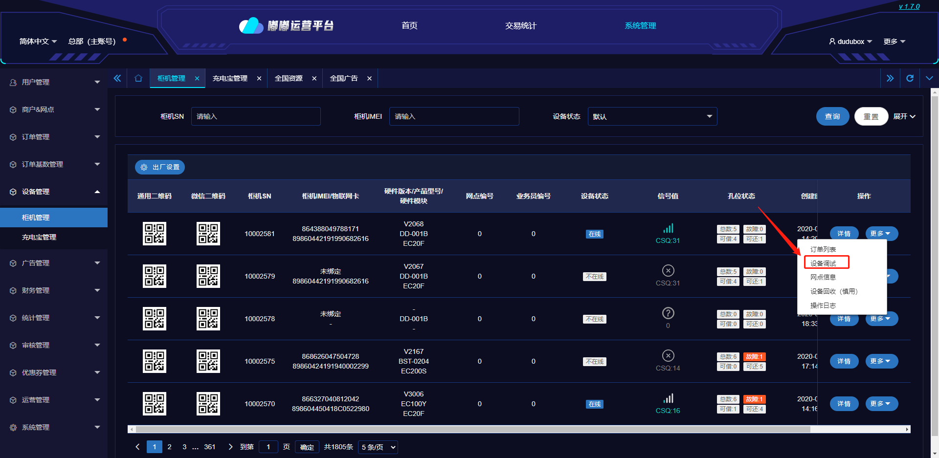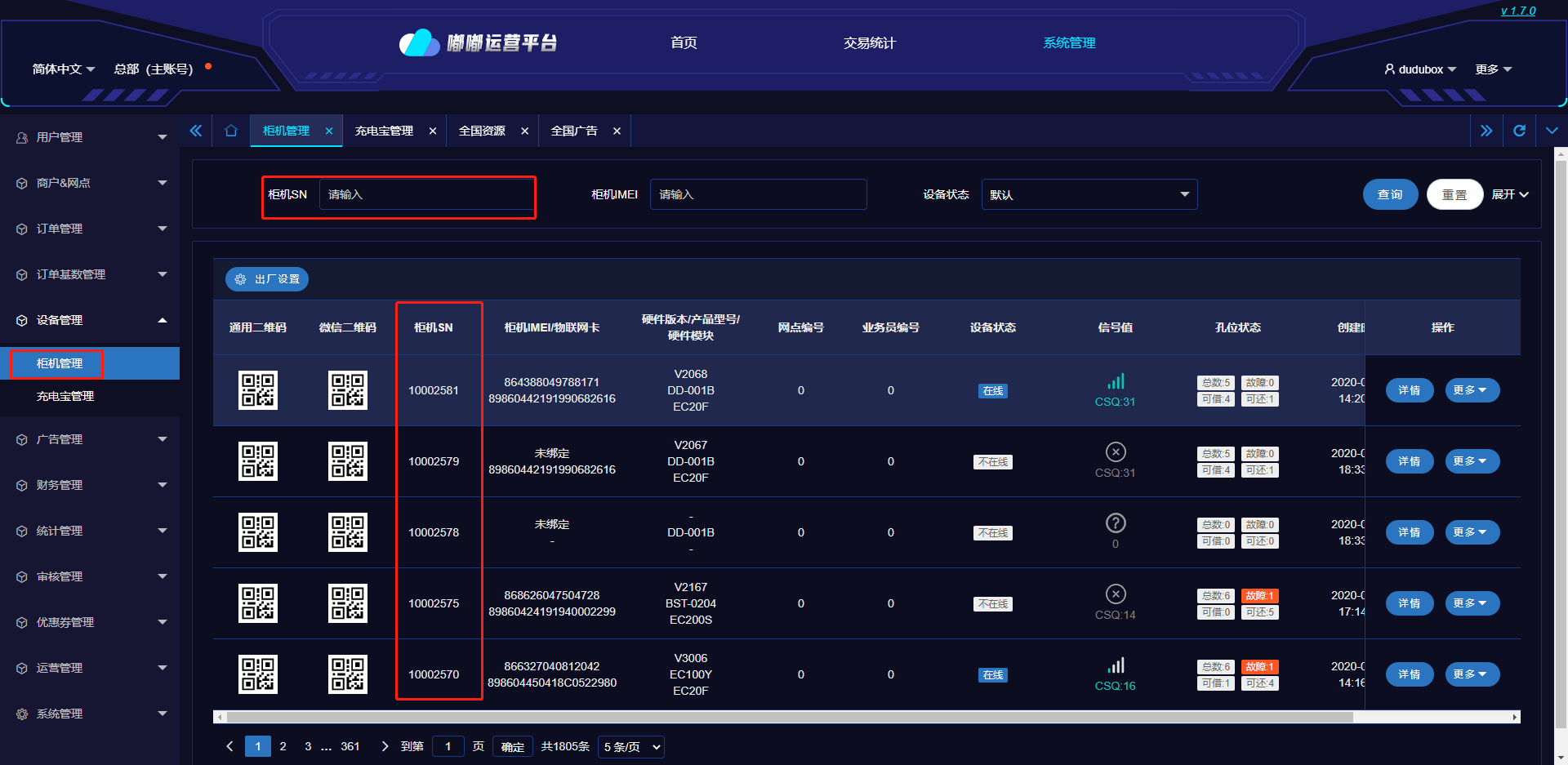 点击【系统管理】→【设备管理】→【柜机管理】,搜索栏输入【柜机SN】搜索柜机