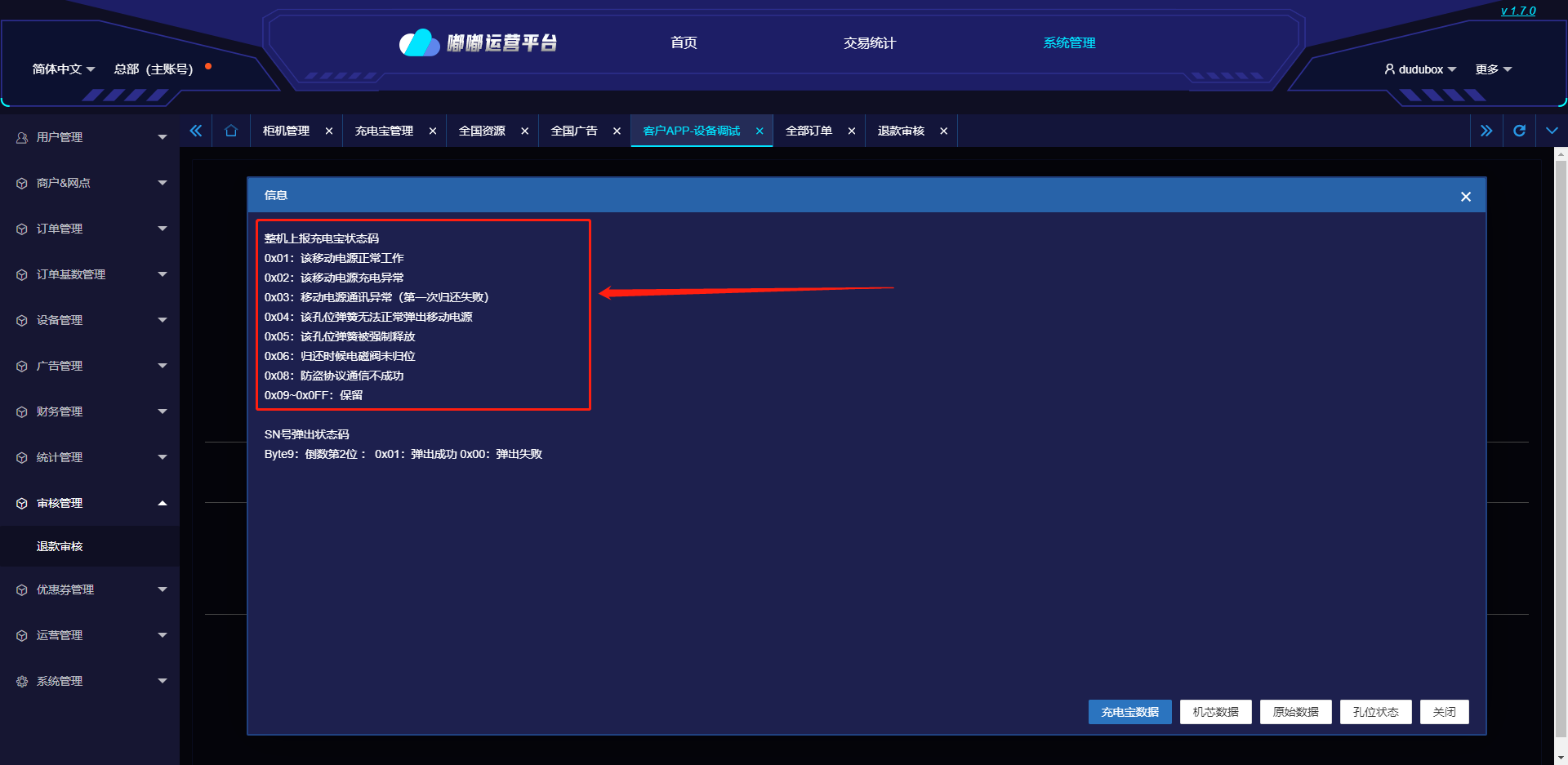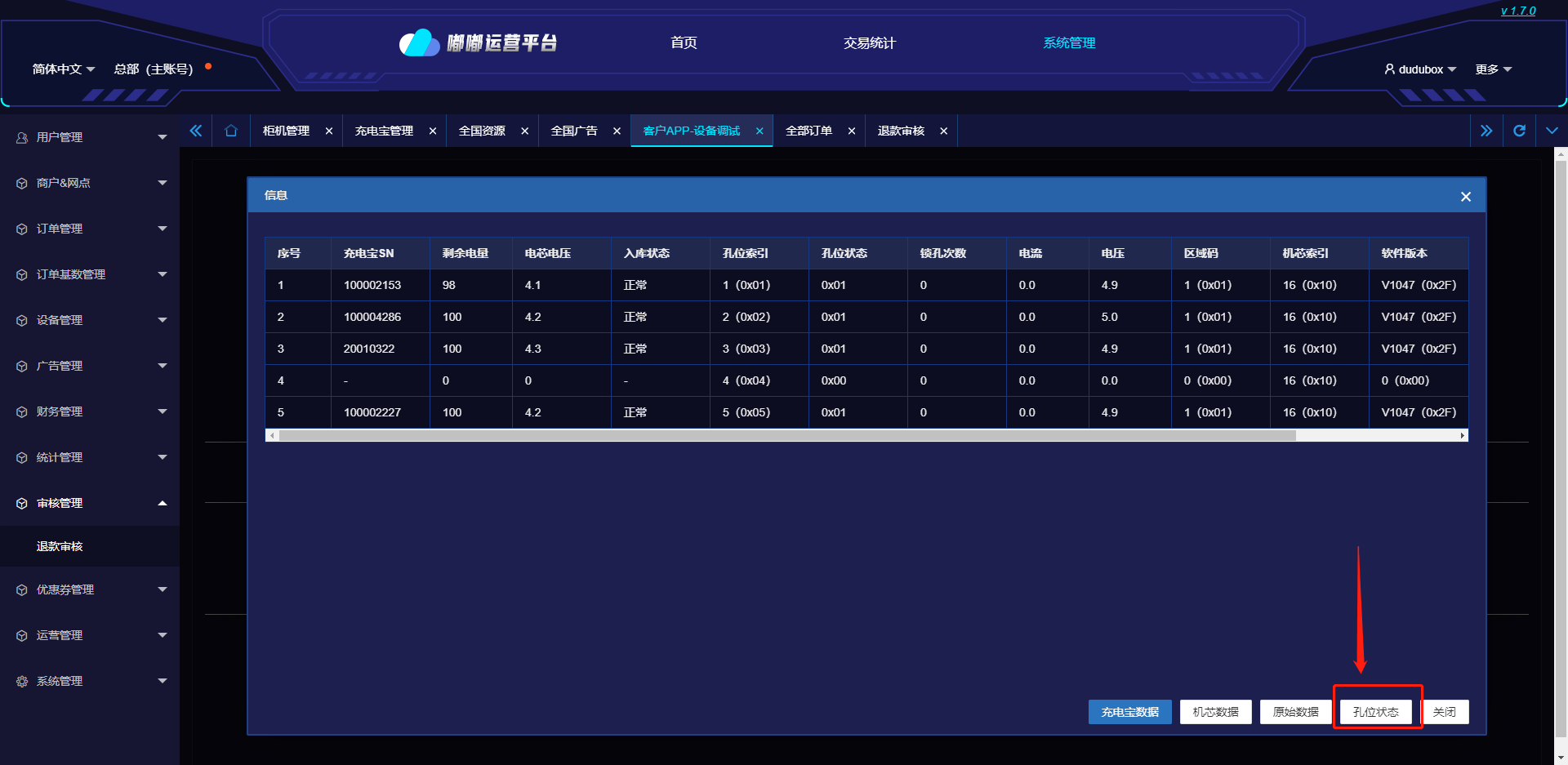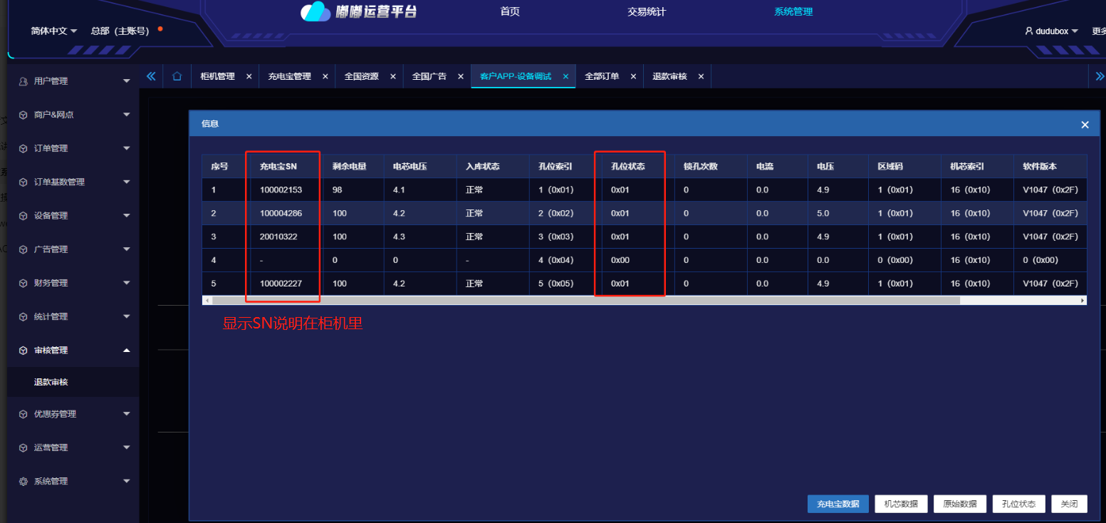 点击【查询全部】,查询柜机内的充电宝信息以及孔位状态