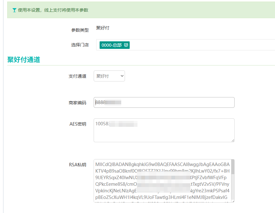 聚商荟后台->系统管理->线上支付设置->配置开通了半屏支付聚好付商编号秘钥等信息保存即可。