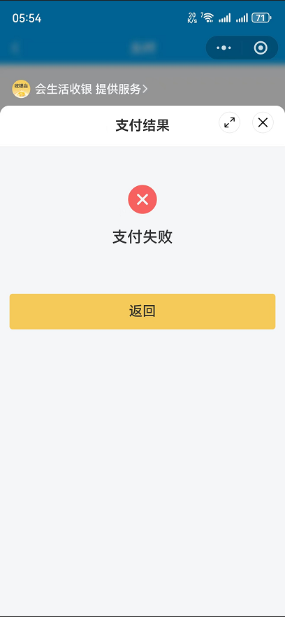 注:半屏支付配置成功后,小程序发起支付会先跳转随行付通道会生活插件,付款方界面出现‘’会生活收银提供服务‘’以此可以判断半屏支付配置成功可以正常使用。