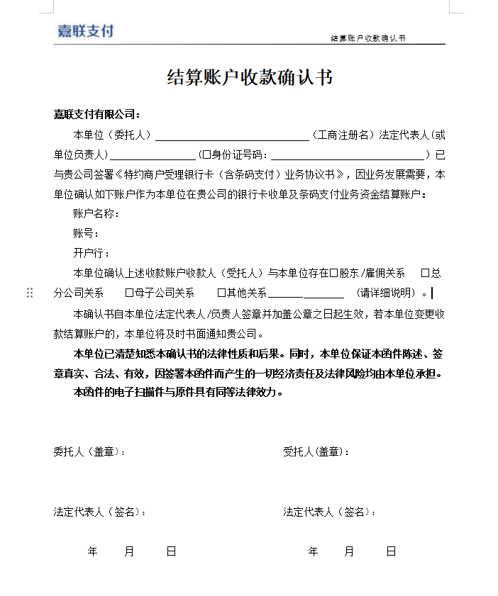 嘉联支付对公结算函说明模板下载(非法人对公结算)