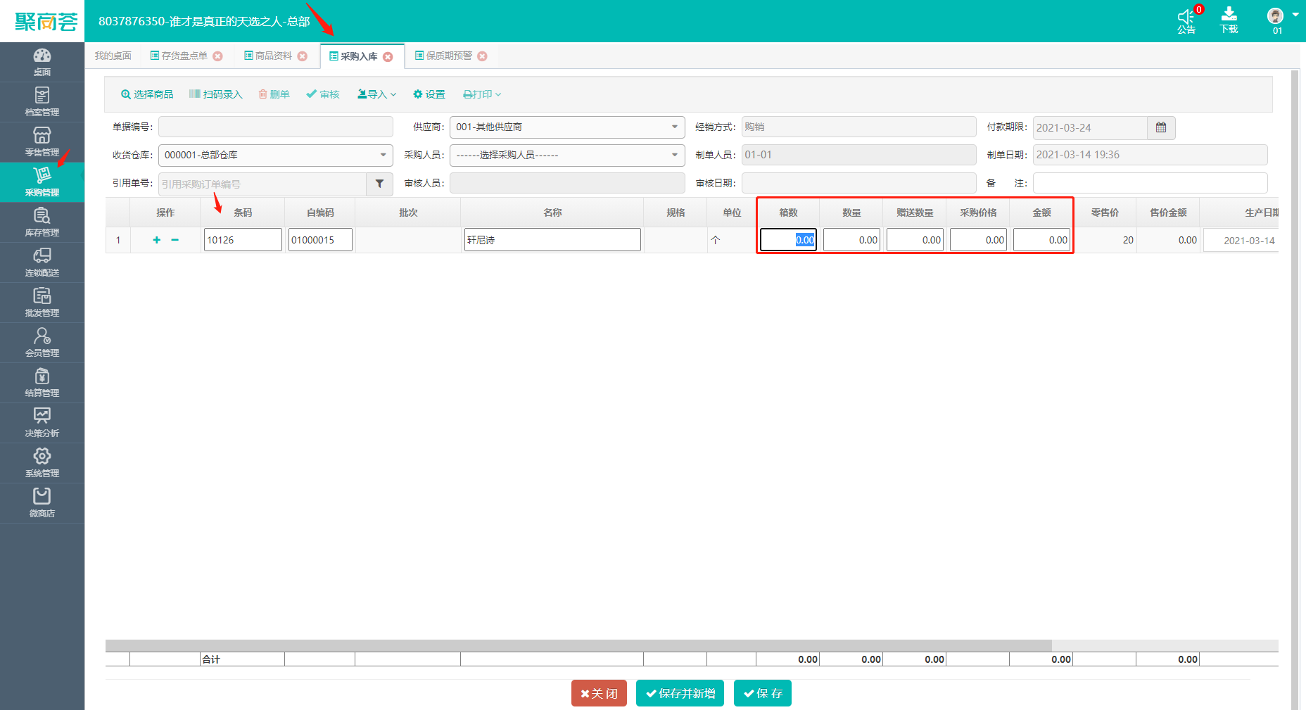 2.箱数与数量必须有一个进行填写,不填写则会提示第3行商品null的箱数和数量不能同时为空!填写箱数会自动转换为数量,