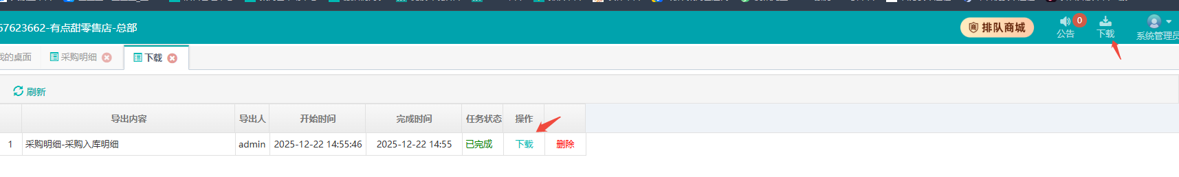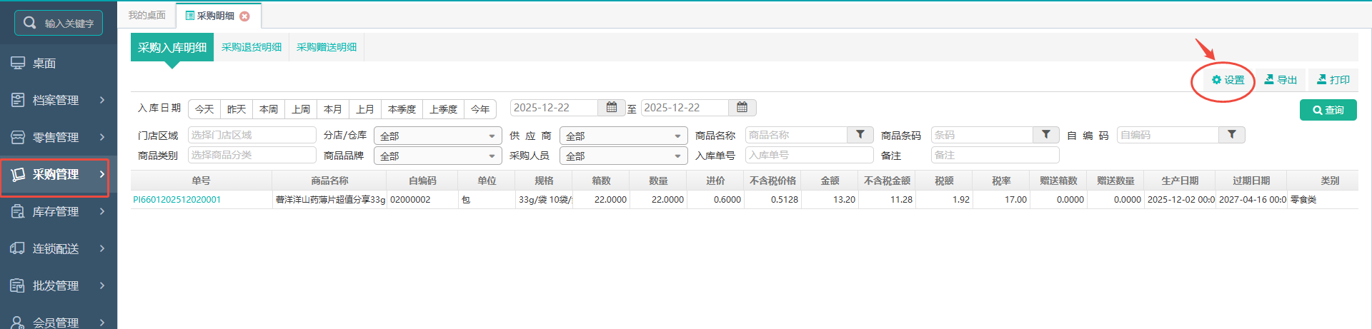 登录聚商荟后台->采购管理->采购明细->查询需要导出单号信息->打开设置