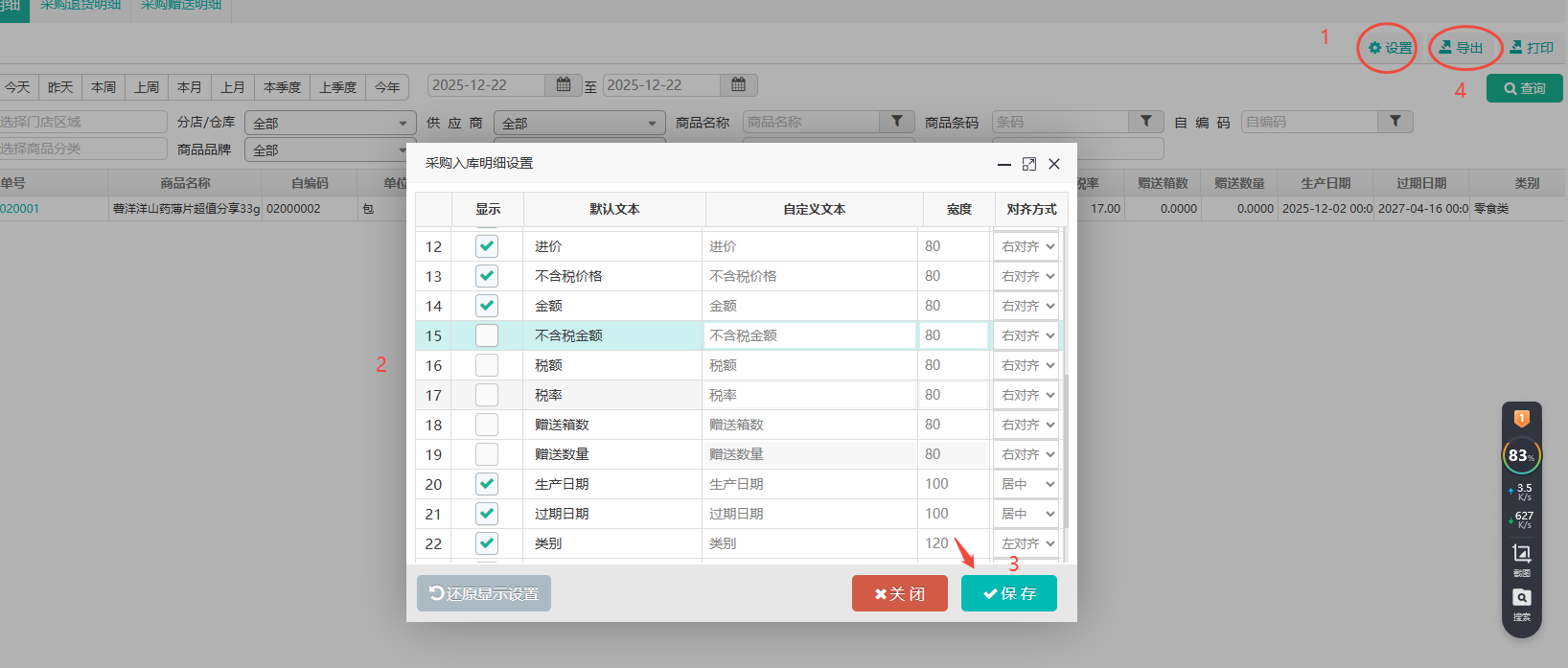 采购明细按自定义字段导出如何操作?