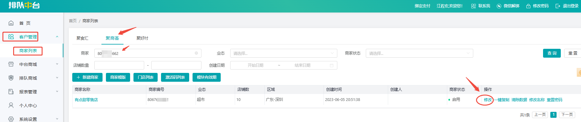 登录排队中台->客户管理->商家列表->聚商荟->查询商户->修改->其他