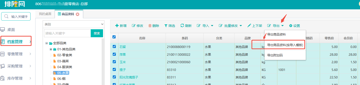 PS:如果不需要导出所有商品资料,只是导出部分商品的话,可以勾选对应类别和商品,在选导出商品资料(按导入模板)即可。