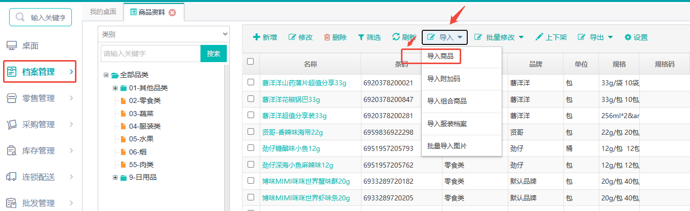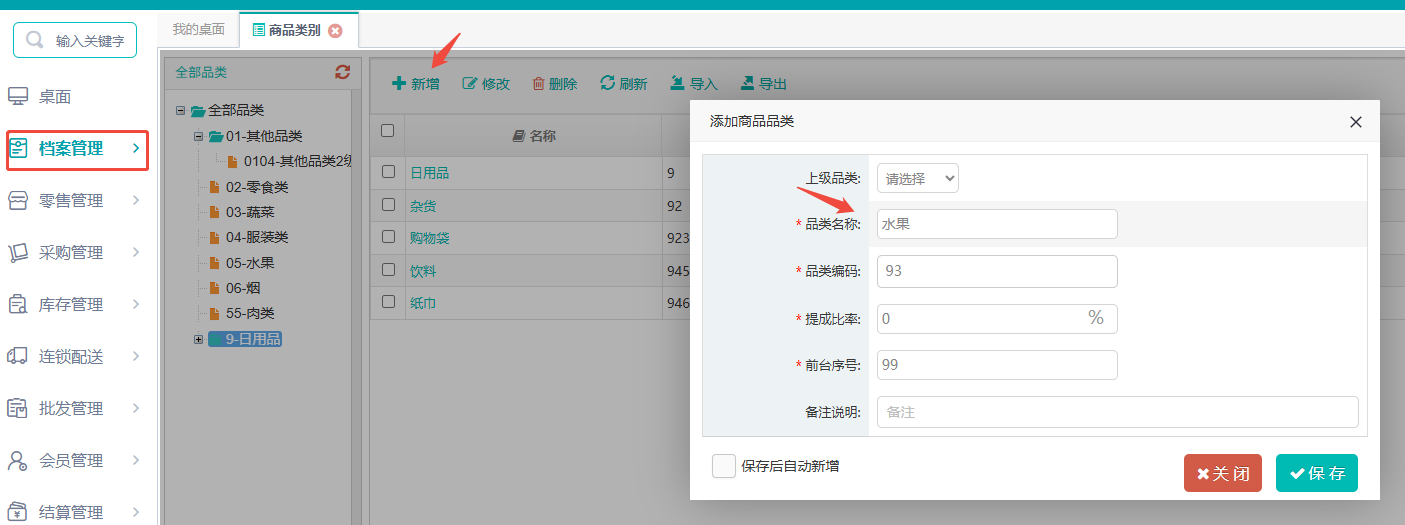 在档案管理-商品类别-新增商品类别名称(对应导入商品资料的商品类别名称)