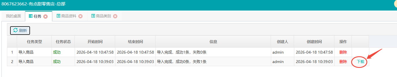 导入结果可以在任务菜单里查看,如失败可以点击下载查看具体那些数据导入失败原因。