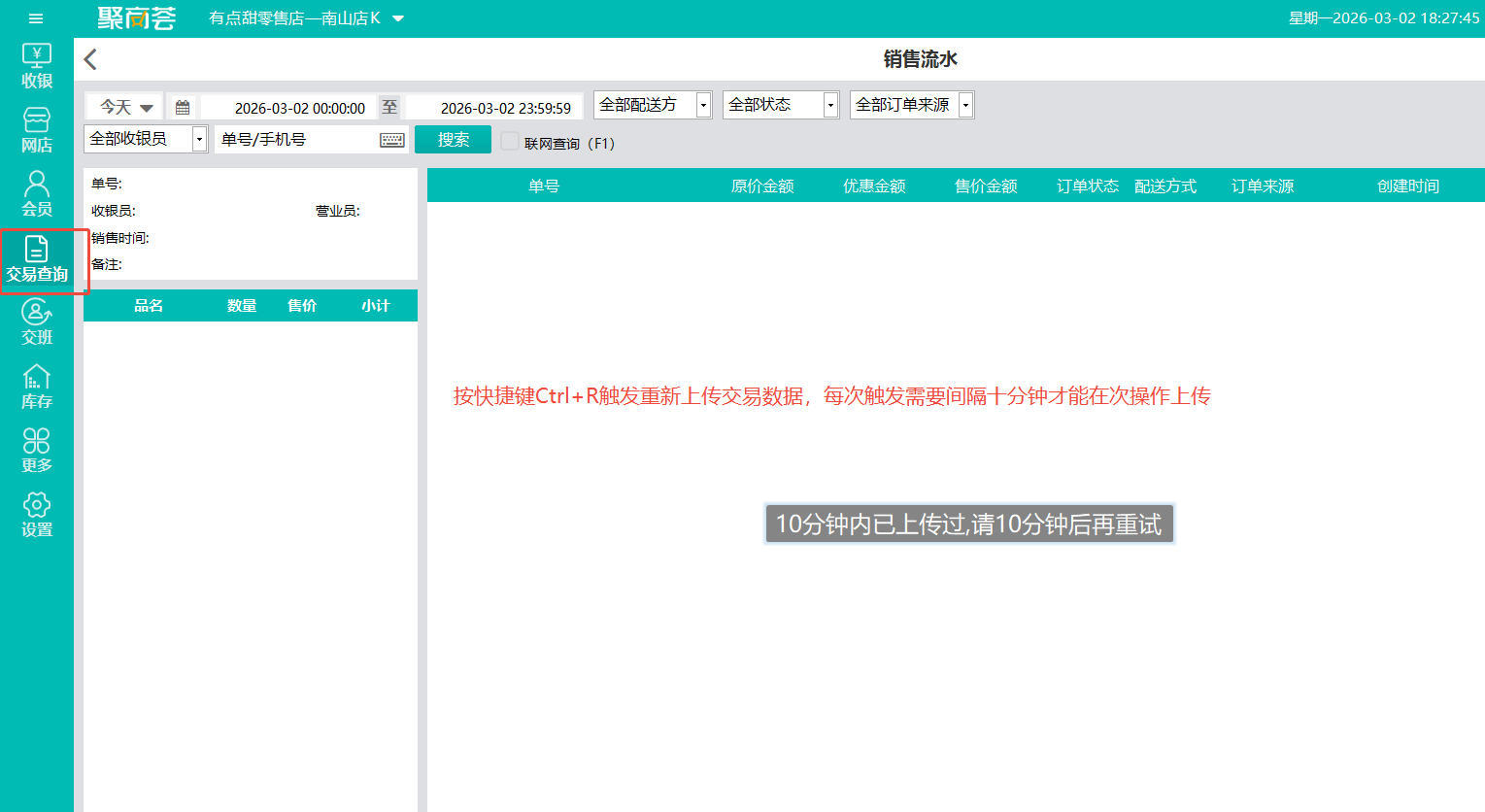 进入前台交易查询报表查询数据不一致日期,按键盘快捷上传方式Ctrl+R触发重新上传前台交易数据,10分钟后再查后台当天交易笔数核对即可。