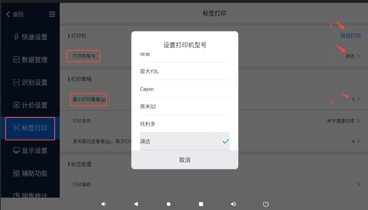 进入标签打印功能界面,打印机型号选择(湃达),最小重量选择(5g),点击测试打印,正常出测试商品标签纸,说明打印机已经正常连接了。
