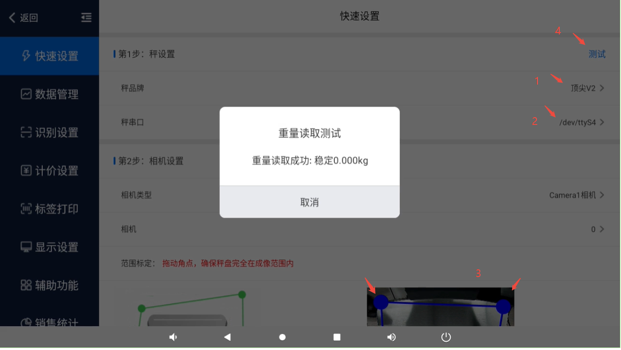 激活AI后会进入快速设置功能界面,秤品牌默认选择顶尖V2,秤串口选择/dev/ttyS4,拖动秤盘四个圆角标,标定好AI识别秤盘范围,不要超出秤盘四个角边缘范围,点击测试读取电子秤取重为0.000kg,则电子秤连接成功可正常使用。