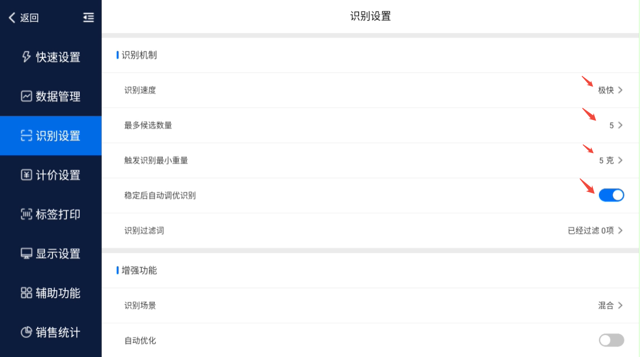 进入识别设置功能模块,识别速度设置极快,最多候选数量(自定义),触发识别最小重量调至5g,开启稳定后自动调优识别。