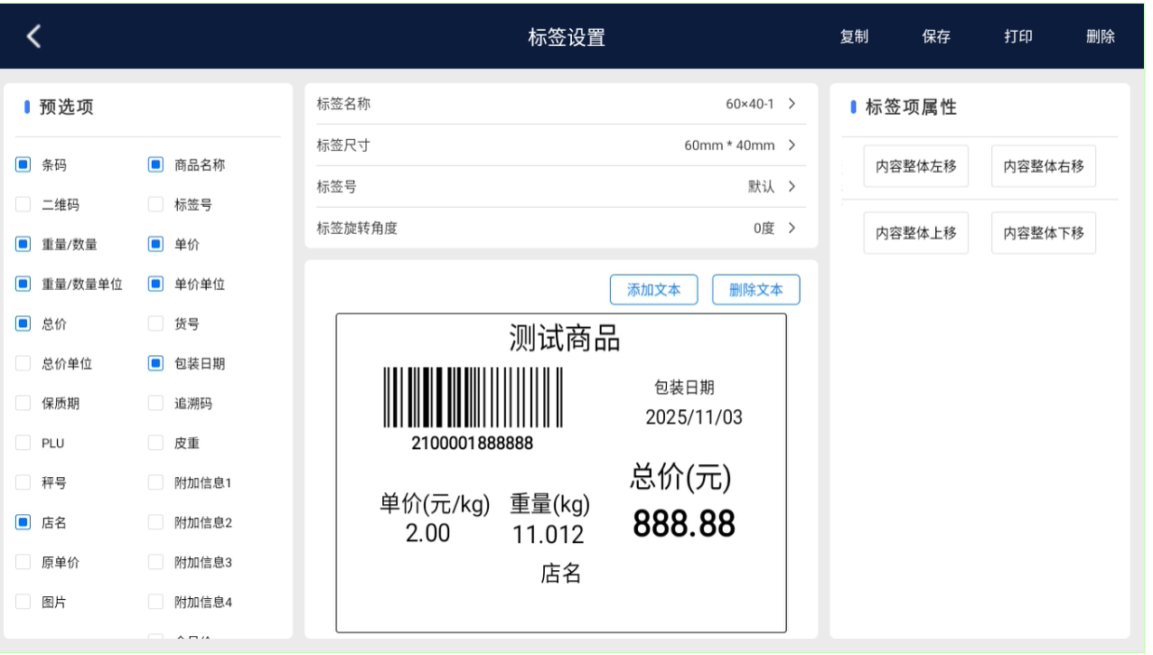 标签打印功能模块下拉底部,进入默认标签模板,根据商户要求自定义设计标签打印模板。
