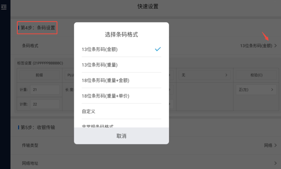 快速设置功能界面,下拉找到条码设置,设置条码生成格式,如13位金额码/13位重量码/18位重量+金额码/18位重量+单价码;设置条码前缀及重量计算单位(kg/500g)。