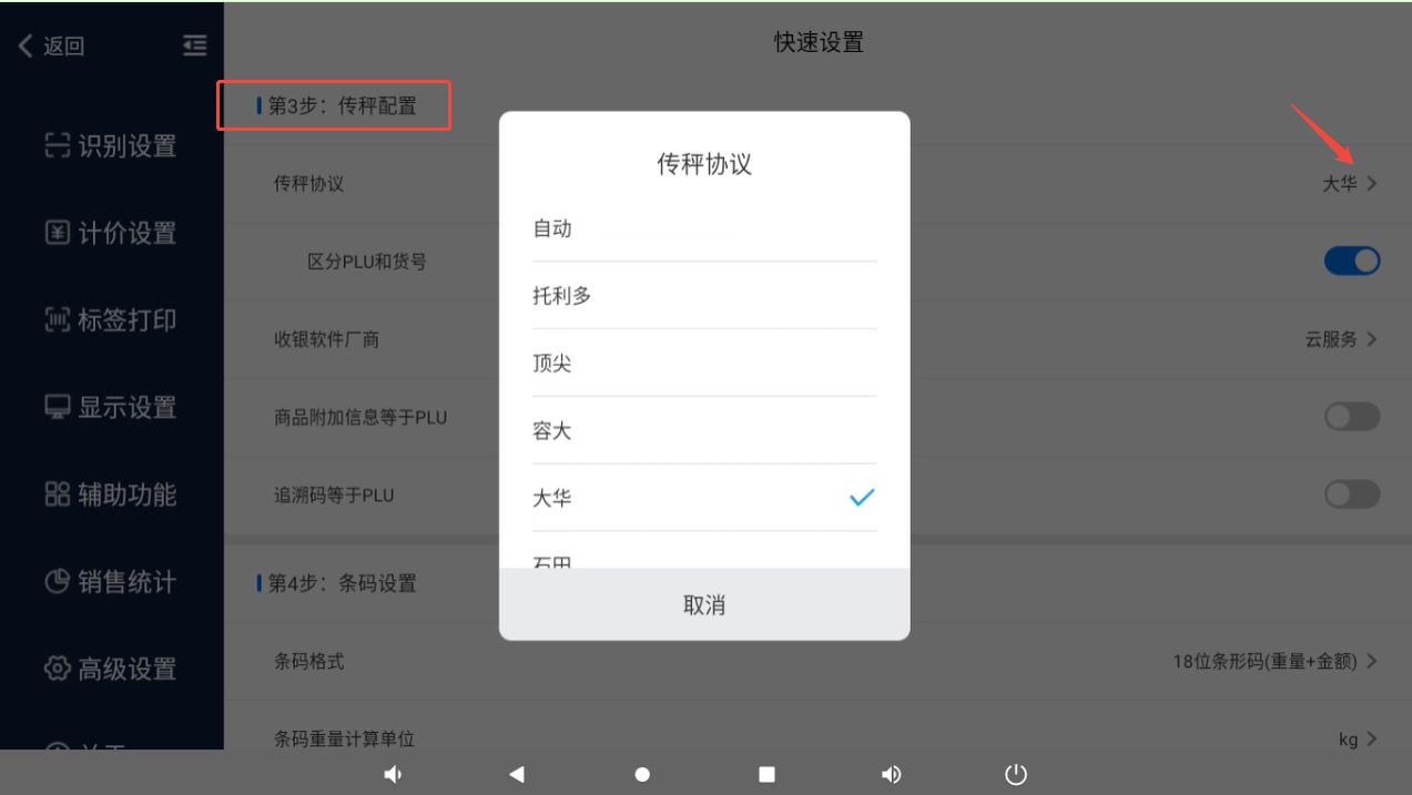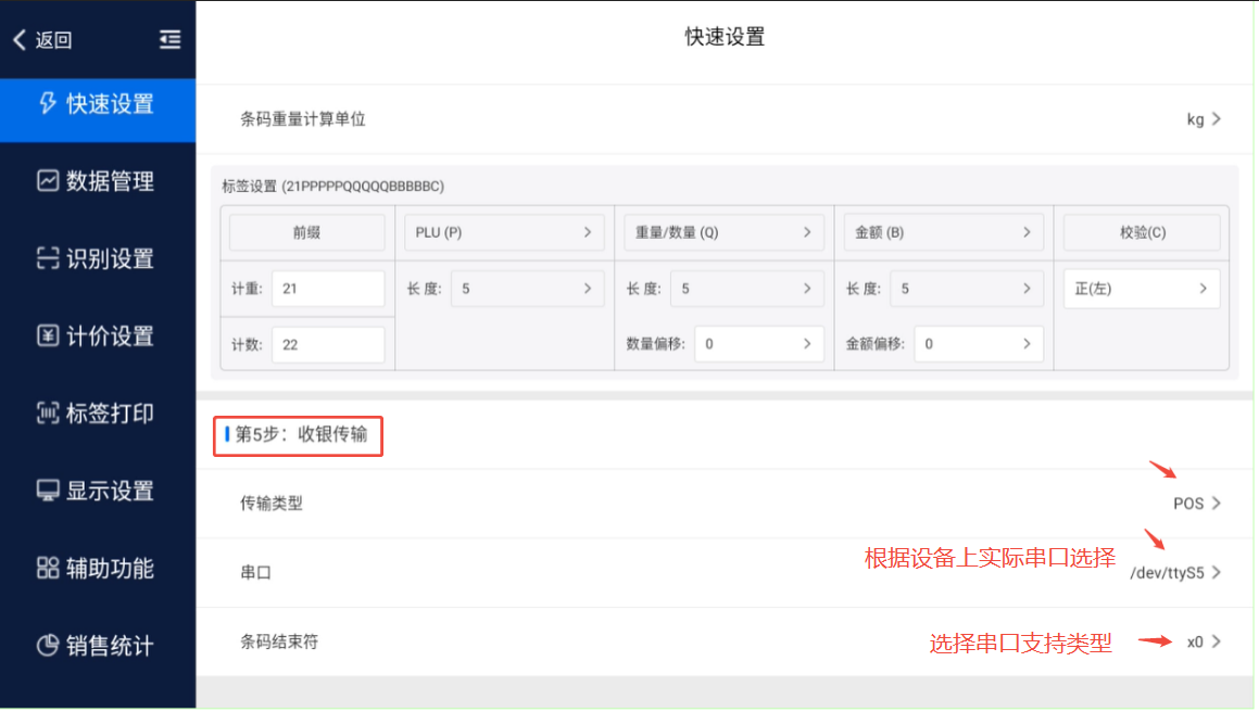 (2)在食方AI软件快速设置-收银传输里设置POS传输方式