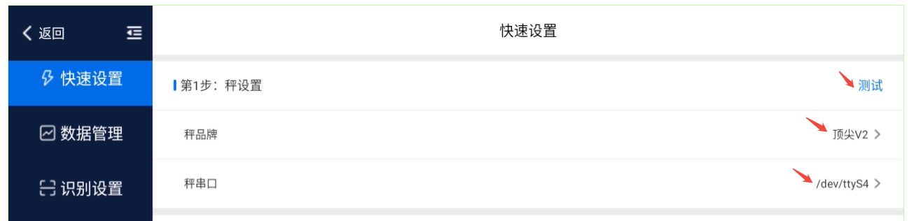 激活AI后会进入快速设置功能界面,秤品牌默认选择顶尖V2,秤串口选择/dev/ttyS4,点击测试读取电子秤取重为0.000kg,则电子秤连接成功可正常使用。