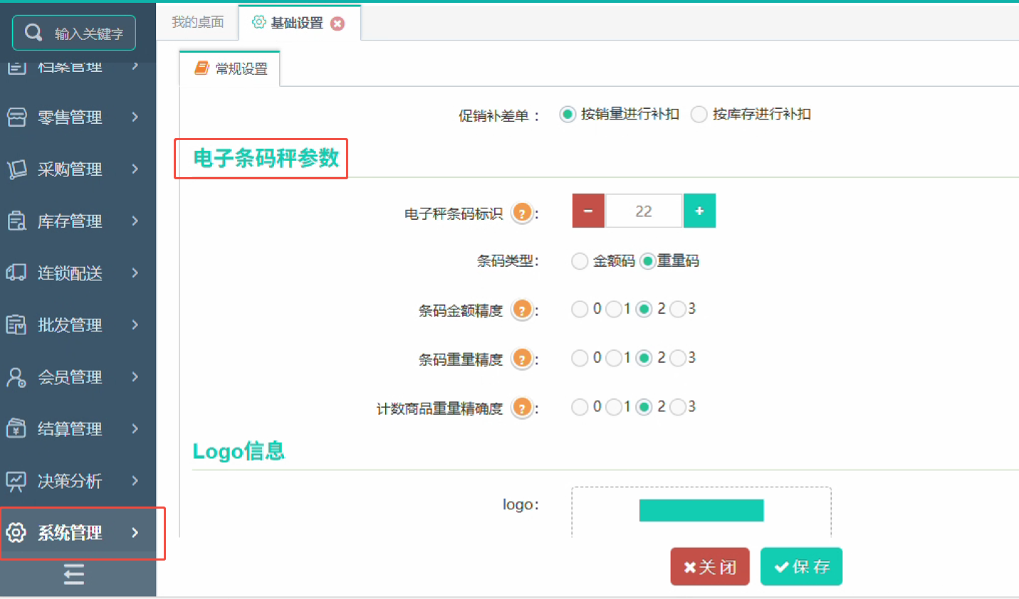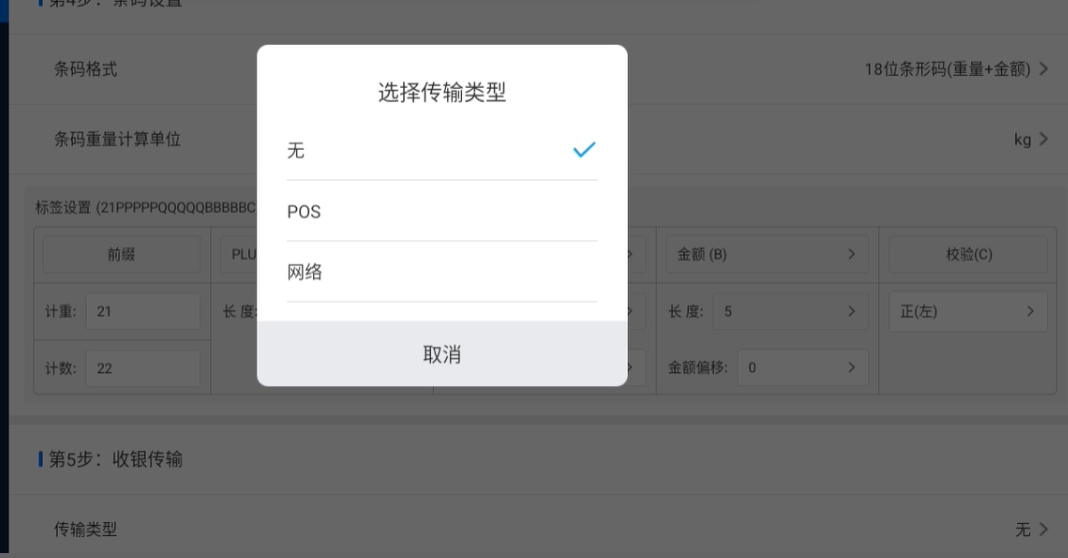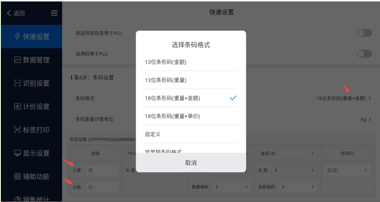 设置条码生成格式,如13位金额码/13位重量码/18位重量+金额码/18位重量+单价码;设置条码计重计数前缀及重量计算单位(kg/500g)。