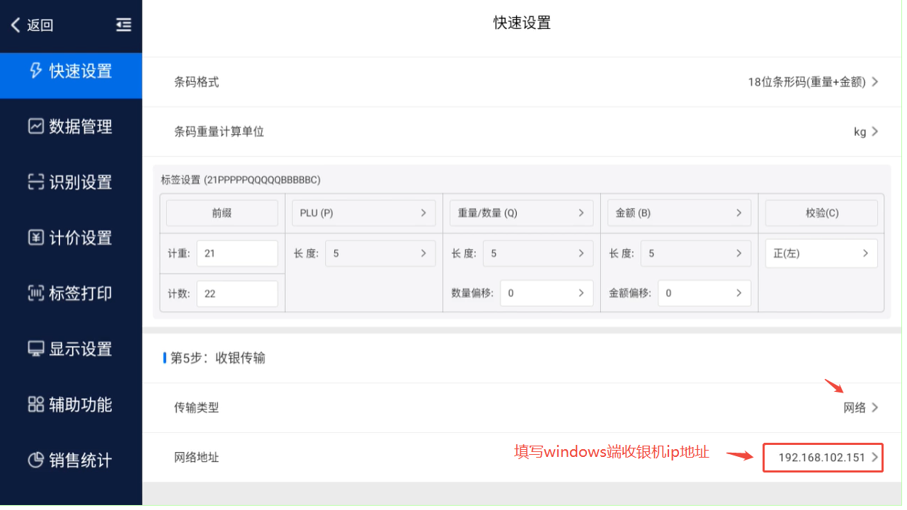 (2)在食方AI软件快速设置-收银传输里设置网络传输方式