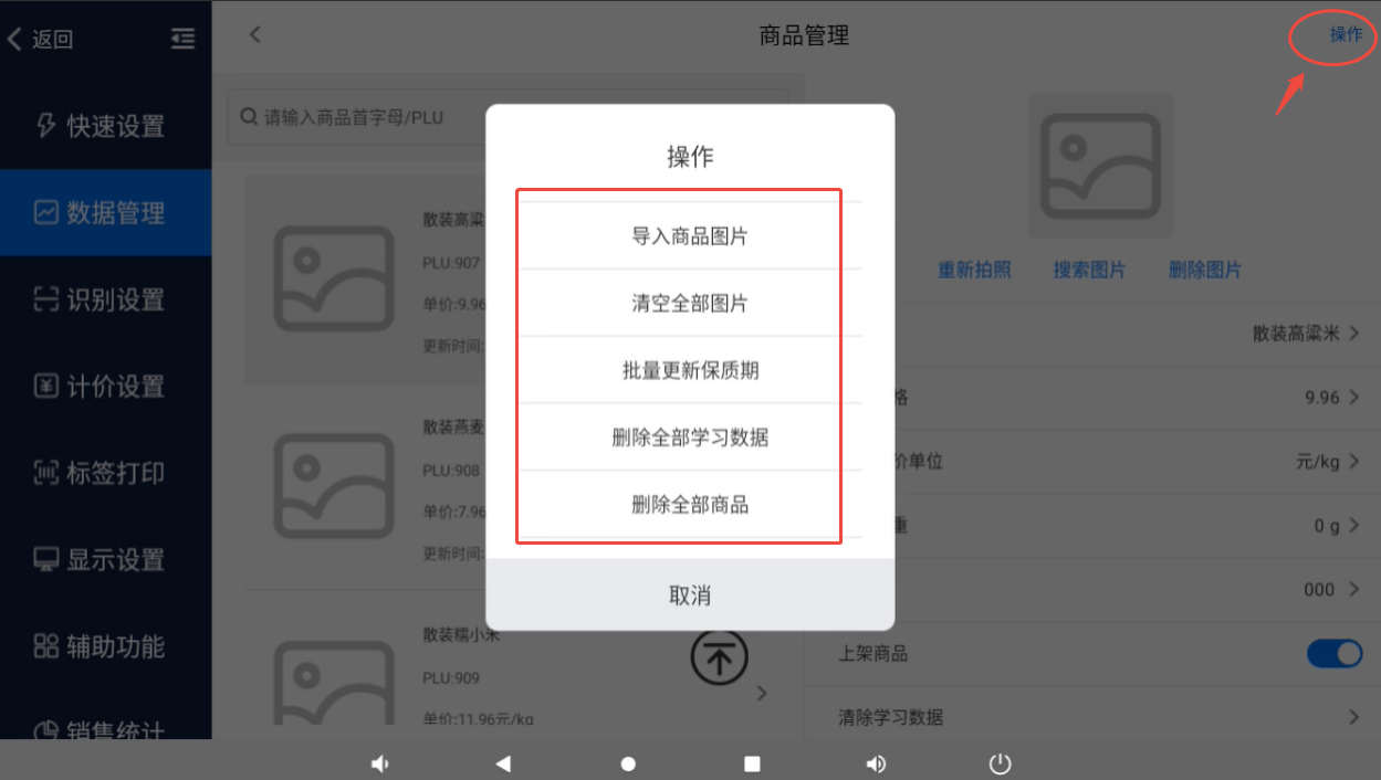 如商品数据和学习数据需要删除,在操作里选择操作项,确认提示输入密码:112233