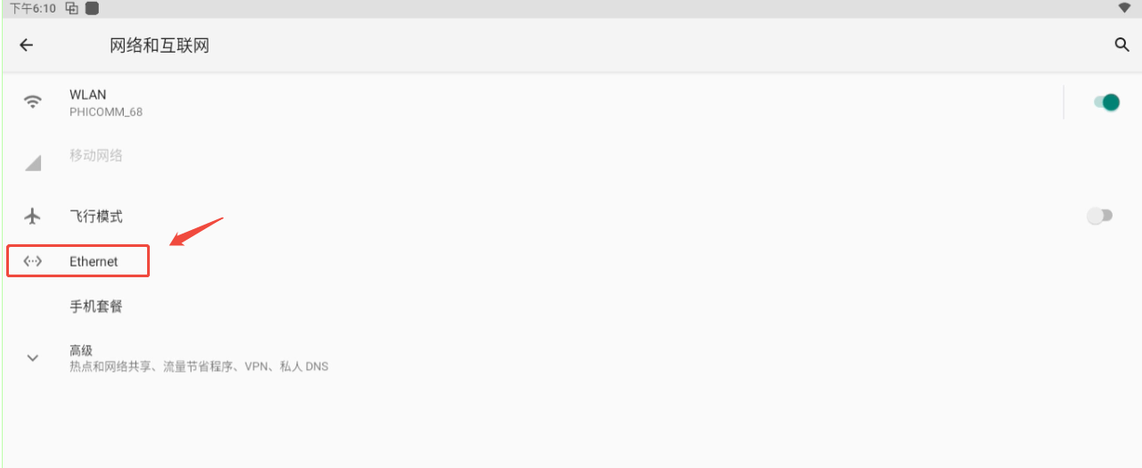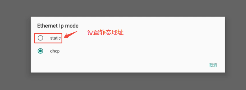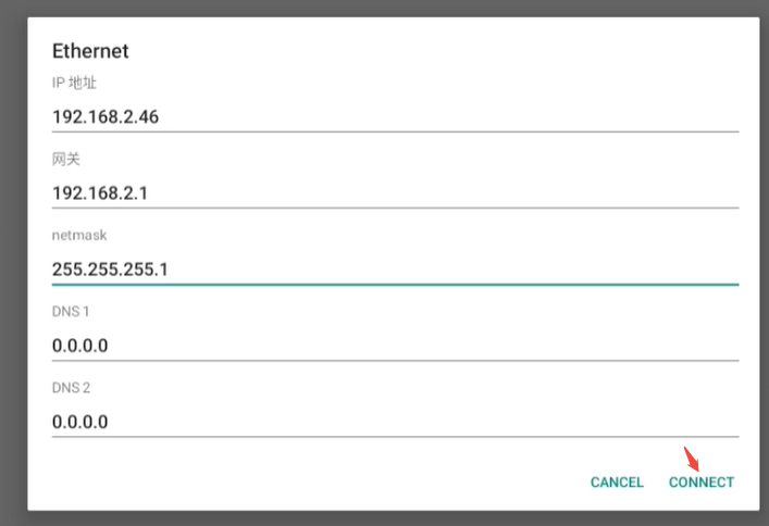 如需设置固定ip模式操作:桌面上划->进入设置->网络和互联网->Ethemet->Ethemet Ip mode->static->设置固定IP地址->CONNECT保存。