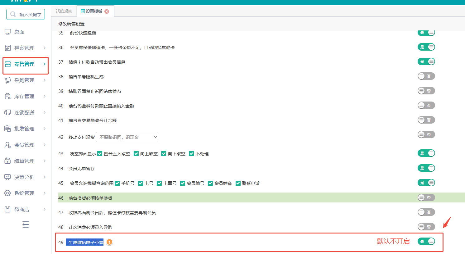 登录聚商荟后台sso.paidui.com ,在零售管理->设置模板或销售设置里,启用49项【 生成微信电子小票】参数->保存->应用门店。