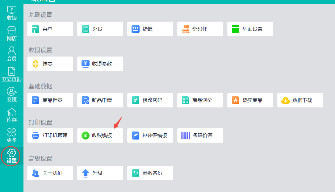 登录前台POS->设置->收银模板->点击保存现有模板即可。