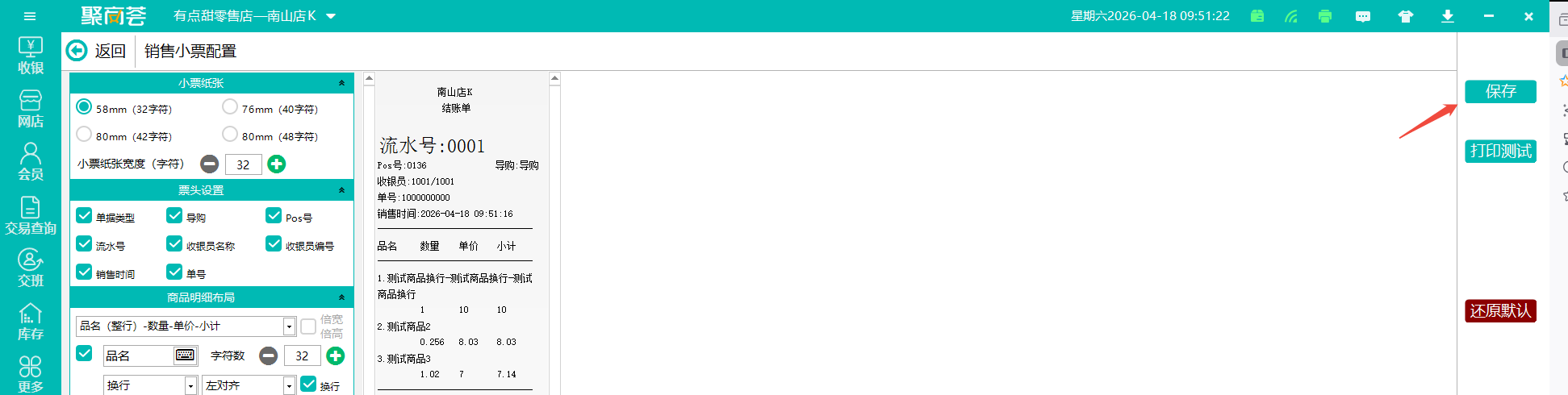 二、前台重新保存收银小票模板(前台需升级到7.1或以上版本)