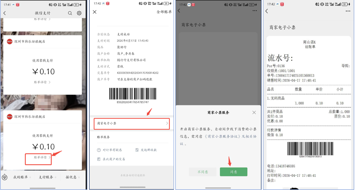 聚商荟前台微信支付后->打开账单详情->商家电子小票->同意开启同步消费小票协议->即可查看前台结账电子小票信息。