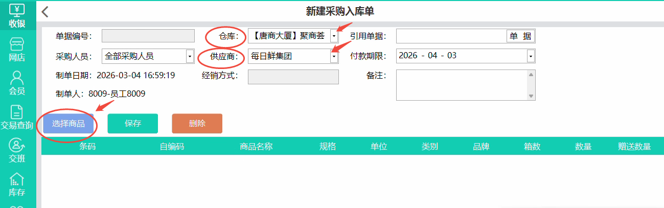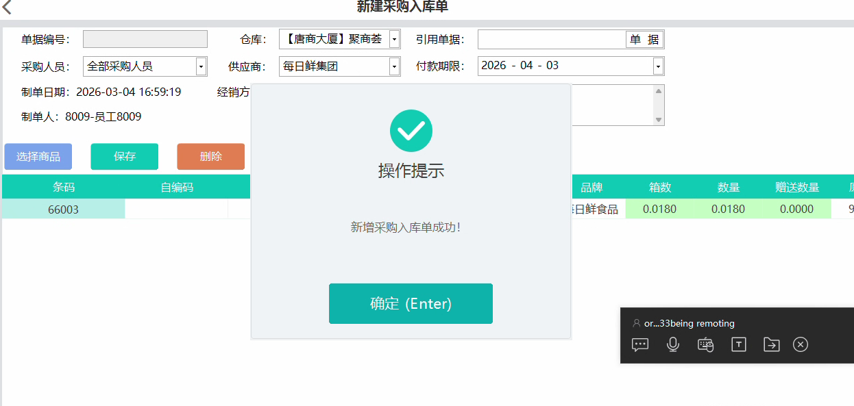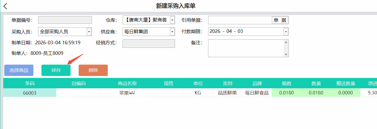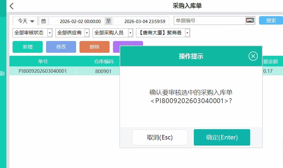->确定->审核单据->确定审核->完成入库。