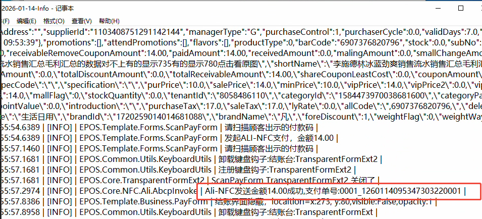 实测支付成功后,logs日志里info文件会显示支付宝NFC支付成功发送金额,如pos界面没有推送提示支付金额,请按五、其他特殊情况处理,去检测支付环境是否有异常处理。