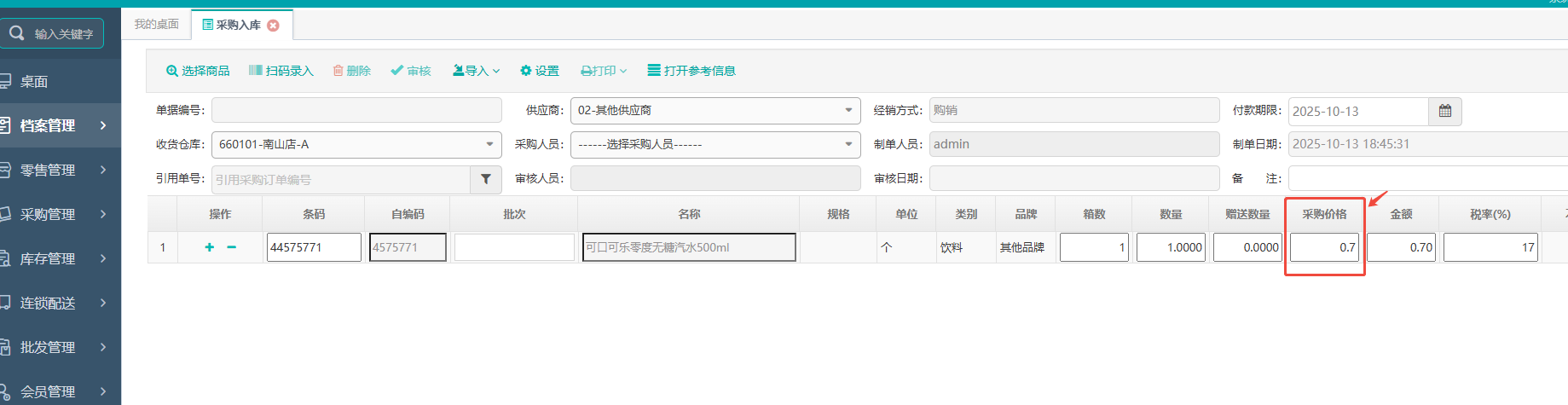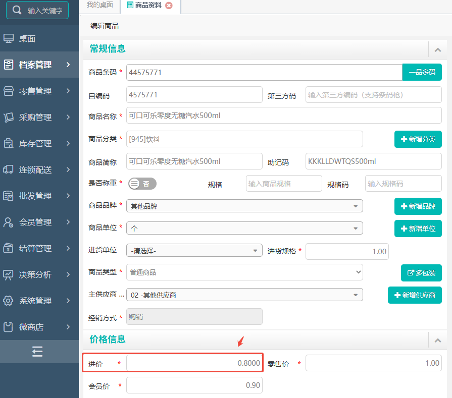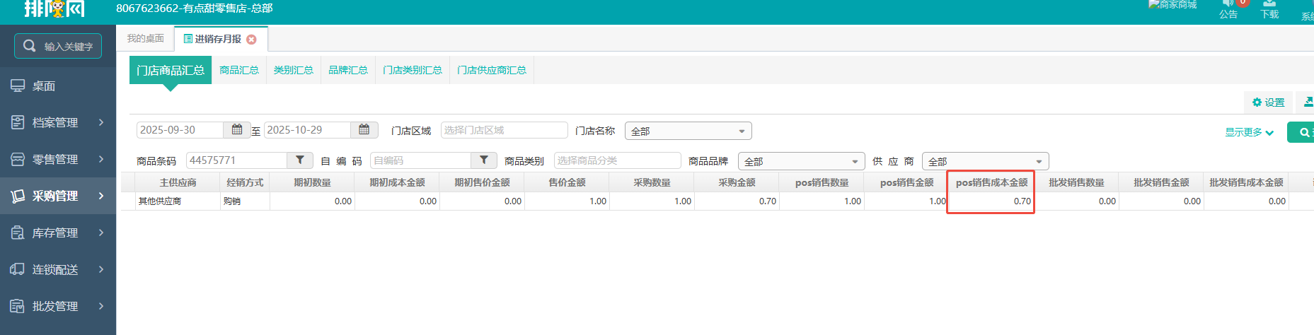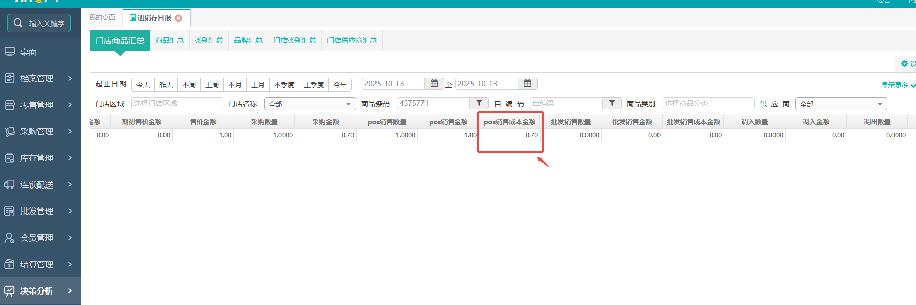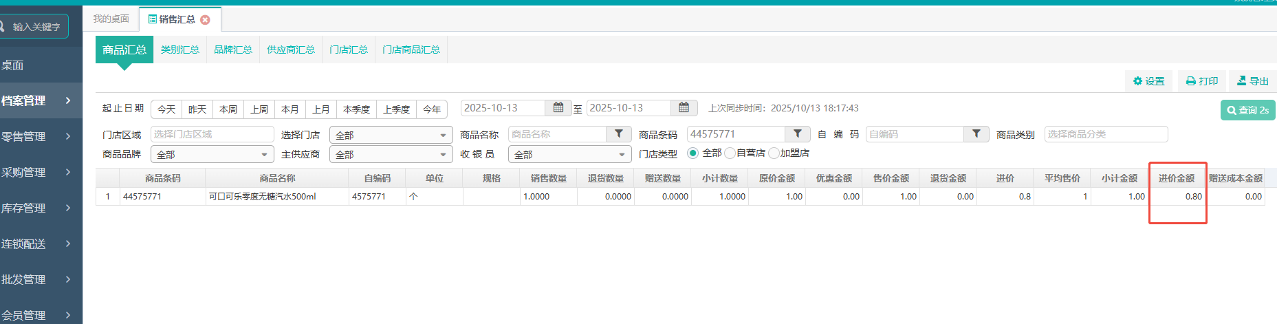 商品:(可口可乐零度无糖汽水500ml)商品资料金额0.8元,采购进价是0.7,那么销售汇总和进销存统计成本金额就会不一致。