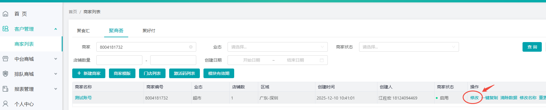 登录中台(mp.paidui.com) 在客户管理->商家列表->根据商家编码或者商户名称查询出商户信息,点击商家名称进入