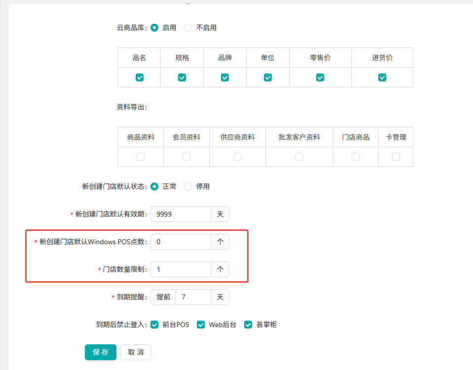 设置新创建门店默认Windows POS点数:不设置POS点数前台机器无法正常登录(系统默认为0)