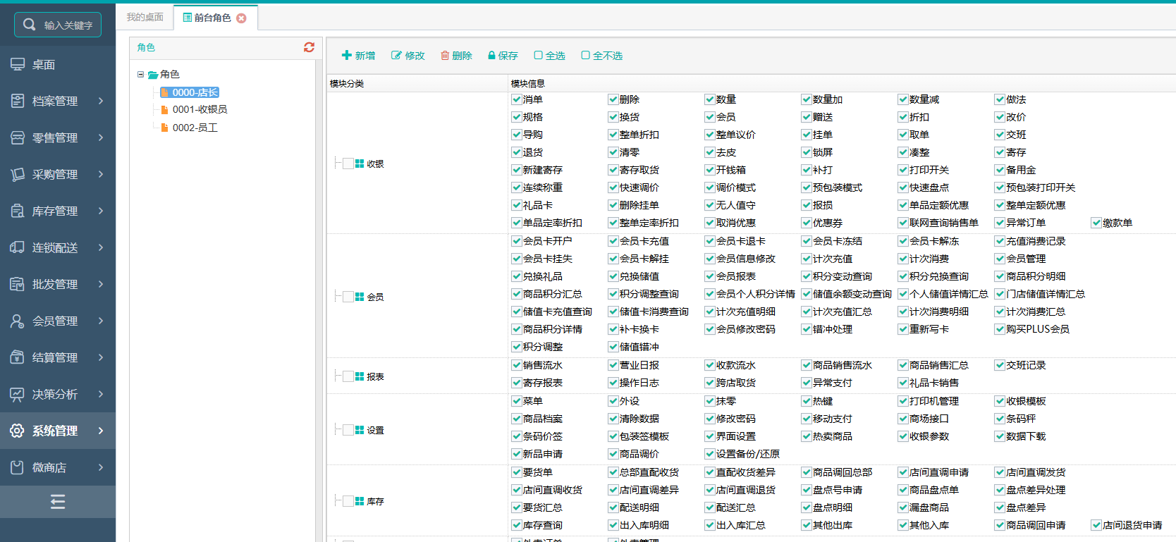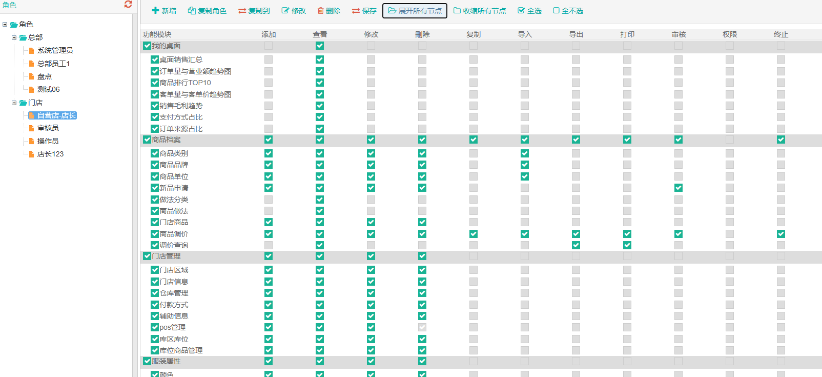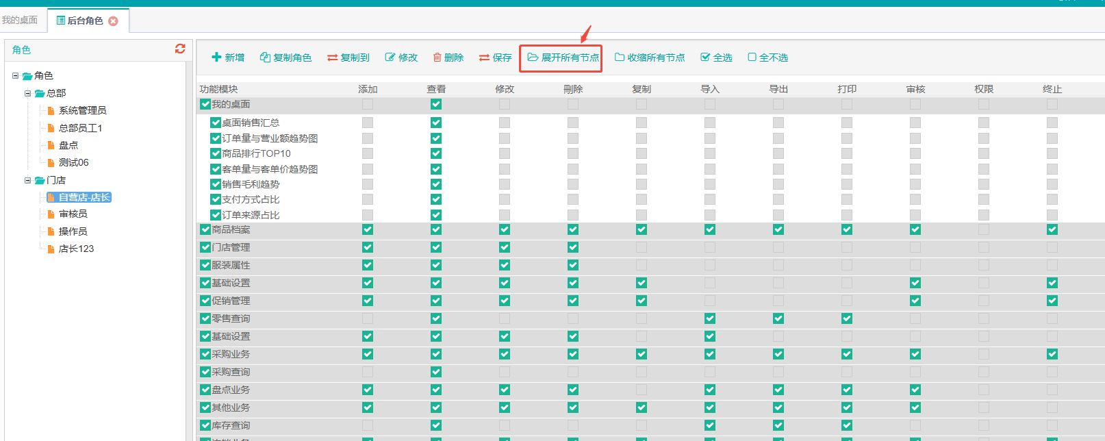 后台角色可以展开所有节点查看,细分模块权限设置。