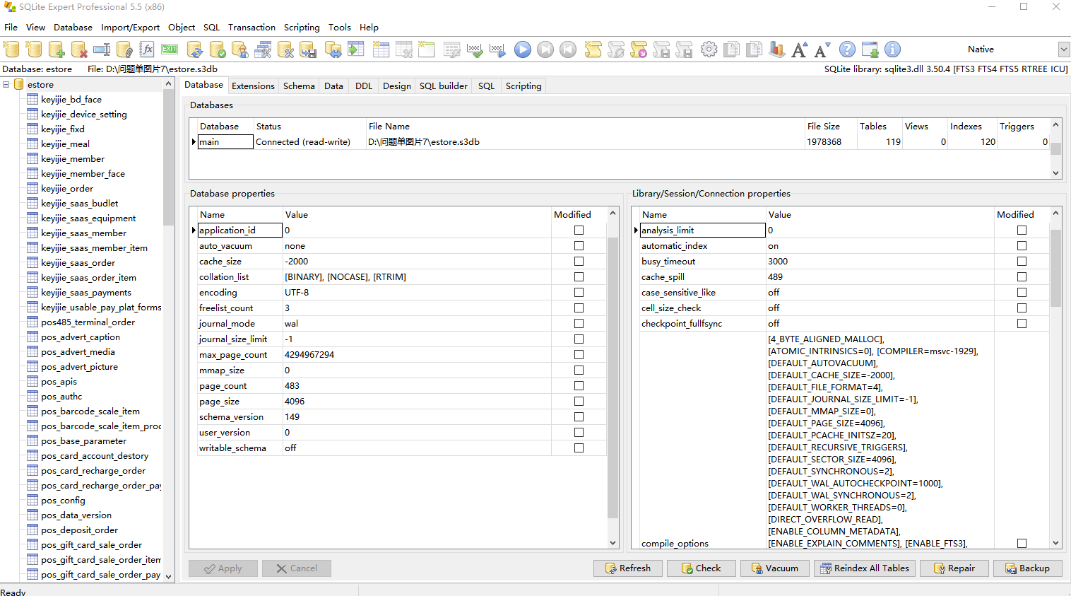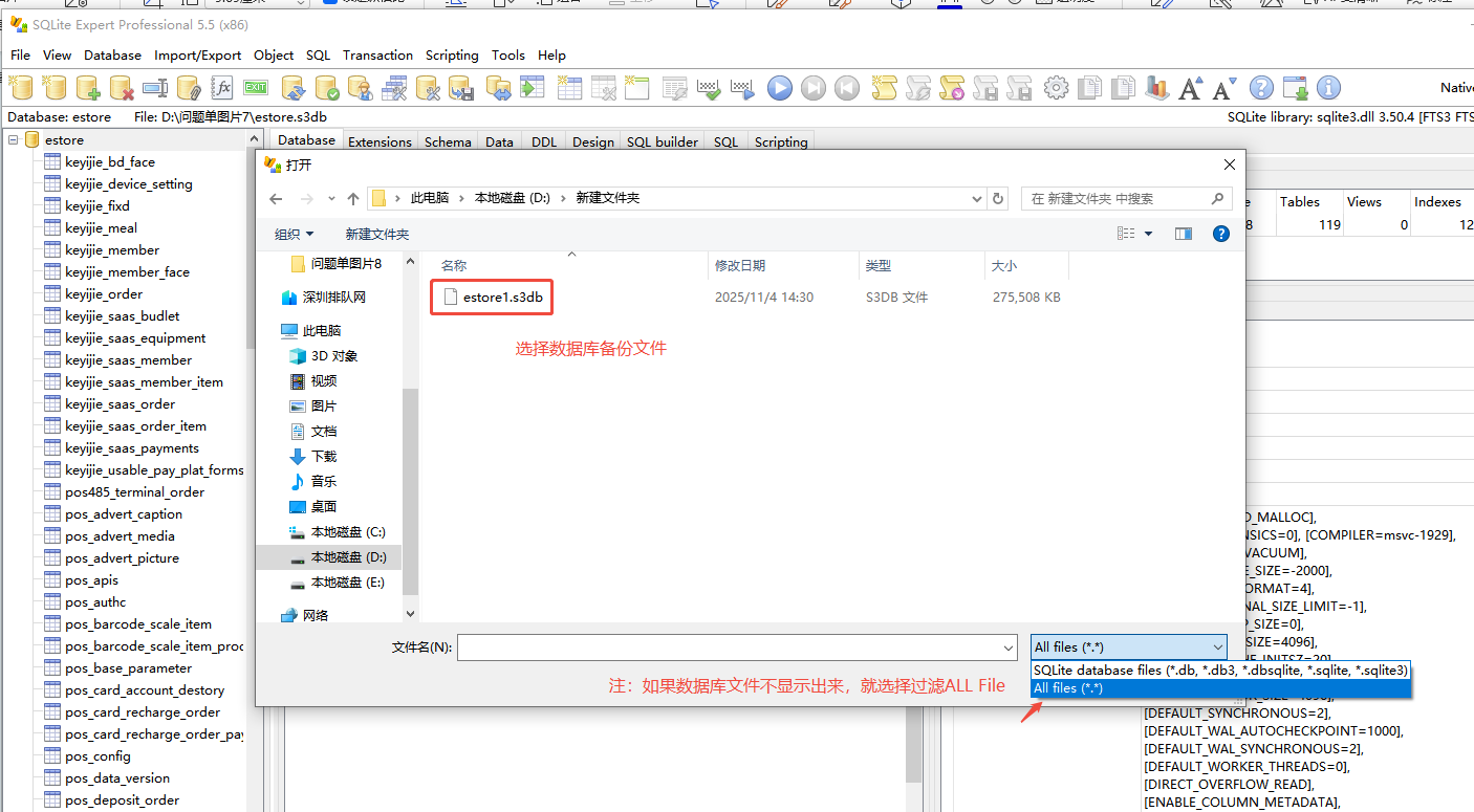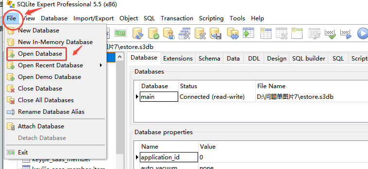 打开SQLiteExpertProSetup32修复工具,点击打开File,选择Open Database进入选择备份数据库文件路径,选择数据库文件点击打开进入修复界面。