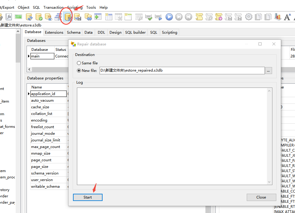 点击下图数据库修复图标,确认数据库备份路径是否准确,点击Start进行修复数据库