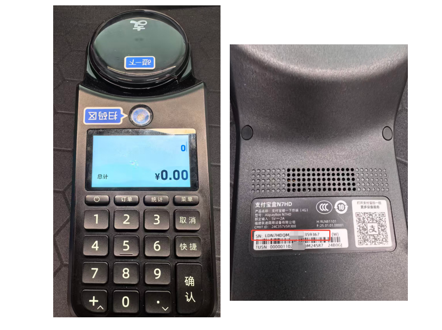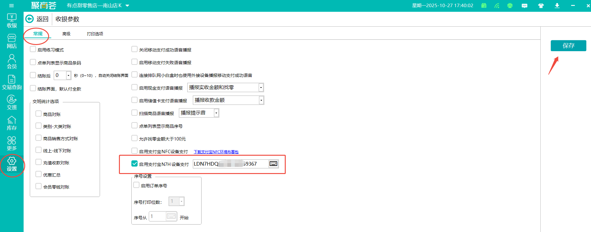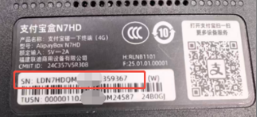 登录聚商荟前台->设置->收银参数->常规->启用支付宝N7H设备支付,输入设备背面完整SN编号->保存。